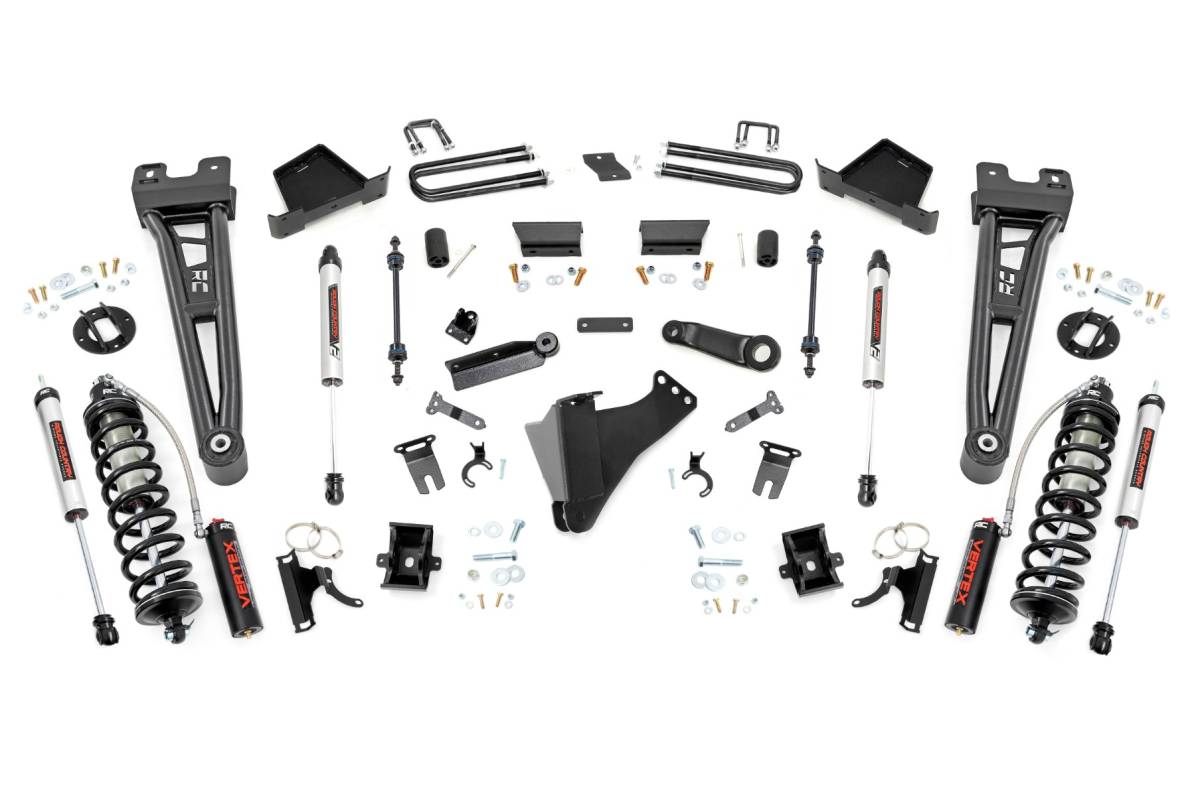 Conquer with Confidence: Elevate your fifth-generation Ford Super Duty with Rough Country's 4.5-Inch Coilover Suspension Lift Kit. Built for off-road warriors and everyday drivers alike, this performance-driven upgrade delivers aggressive ride height without sacrificing comfort. Run up to 35-inch tires and take command of any terrain with confidence and control. Adjustable Performance, Superior Ride: Fine-tune your stance with fully adjustable Vertex coilovers designed for maximum clearance and responsiveness. These 2.5-inch, nitrogen-charged monotube coilovers feature 8-stage adjustability and external reservoirs offering 56% more fluid capacity for cooler, more consistent performance. A secondary V2 monotube shock at each front corner creates a dual-shock setup that enhances stability and control on every journey. Stronger by Design: Heavy-duty 1/4-inch fabricated coilover mounts ensure maximum strength and durability under the harshest conditions. Tubular radius arms feature a massive 2-inch outer diameter, precision-fit for OEM mounts, maintaining a factory-like suspension angle while delivering unmatched strength. Durable rubber bushings help absorb vibration, promoting a smoother, quieter ride on or off the road. Enhanced Rear Suspension: Heavy-duty fabricated lift blocks outperform cast alternatives in strength and reliability. Anti-axle wrap rear blocks preserve factory ride quality while eliminating unwanted axle movement. For all-terrain control, upgrade with optional V2 or Vertex rear shocks to complete a four-corner performance package. Hassle-Free Installation: This system is fully bolt-on, no cutting or drilling required. Top-mounted reservoir brackets ensure clean, secure placement, while front-to-rear leveling eliminates factory rake for a more aggressive, balanced stance. Boosted ground clearance improves off-road capability, and enhanced suspension geometry keeps your Super Duty performing at its best. Backed by Confidence: Covered by Rough Country's Limited Lifetime Replacement Warranty, this 4.5-Inch Coilover Lift Kit offers peace of mind with every mile. Drive harder. Ride smoother. Lift smarter with Rough Country.