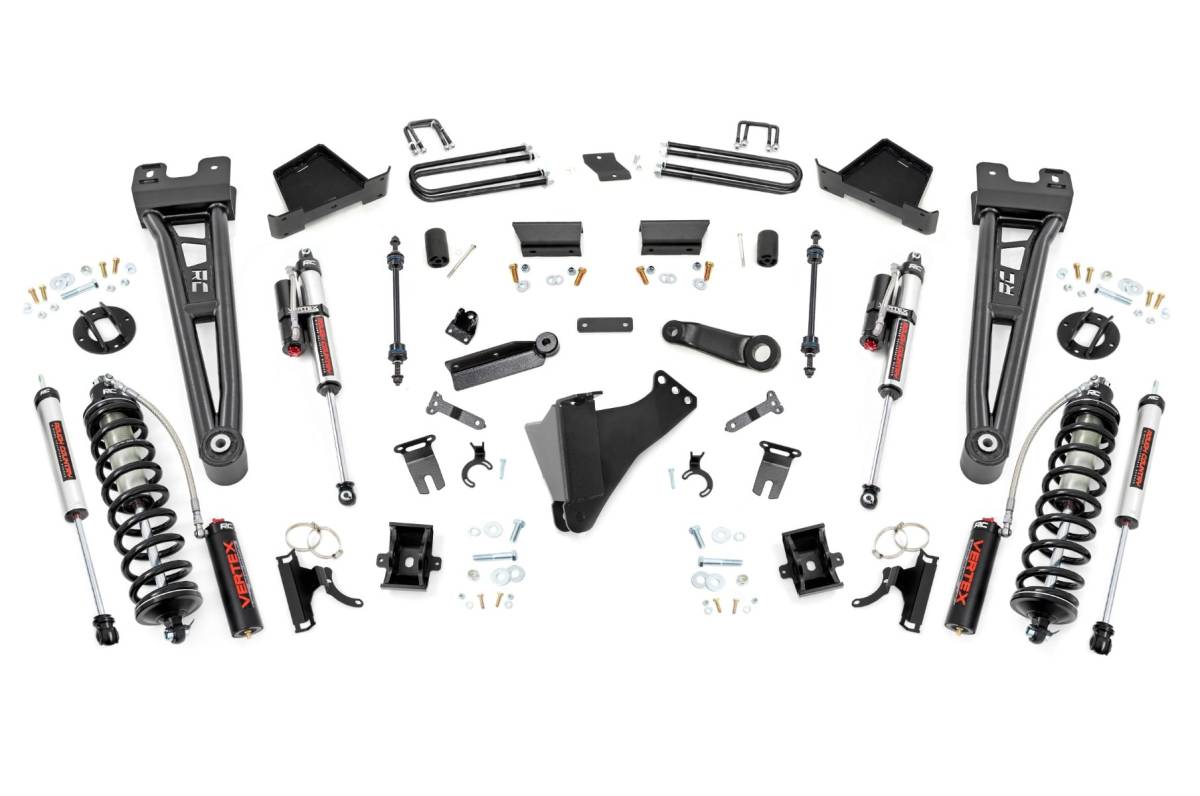 Top-mounted reservoir brackets ensure clean, secure placement, while front-to-rear leveling eliminates factory rake for a more aggressive, balanced stance. Boosted ground clearance improves off-road capability, and enhanced suspension geometry keeps your Super Duty performing at its best. Backed by Confidence: Covered by Rough Country's Limited Lifetime Replacement Warranty, this 6-Inch Coilover Lift Kit offers peace of mind with every mile. Drive harder. Ride smoother. Lift smarter with Rough Country. Conquer with Confidence: Elevate your fifth-generation Ford Super Duty with Rough Country's 6-Inch Coilover Suspension Lift Kit. Built for off-road warriors and everyday drivers alike, this performance-driven upgrade delivers aggressive ride height without sacrificing comfort. Run up to 37-inch tires and take command of any terrain with confidence and control. Adjustable Performance, Superior Ride: Fine-tune your stance with fully adjustable Vertex coilovers designed for maximum clearance and responsiveness. These 2.5-inch, nitrogen-charged monotube coilovers feature 8-stage adjustability and external reservoirs offering 56% more fluid capacity for cooler, more consistent performance. A secondary V2 monotube shock at each front corner creates a dual-shock setup that enhances stability and control on every journey. Stronger by Design: Heavy-duty 1/4-inch fabricated coilover mounts ensure maximum strength and durability under the harshest conditions. Tubular radius arms feature a massive 2-inch outer diameter, precision-fit for OEM mounts, maintaining a factory-like suspension angle while delivering unmatched strength. Durable rubber bushings help absorb vibration, promoting a smoother, quieter ride on or off the road. Enhanced Rear Suspension: Heavy-duty fabricated lift blocks outperform cast alternatives in strength and reliability. Anti-axle wrap rear blocks preserve factory ride quality while eliminating unwanted axle movement. For all-terrain control, upgrade with optional V2 or Vertex rear shocks to complete a four-corner performance package. Hassle-Free Installation: This system is fully bolt-on, no cutting or drilling required.