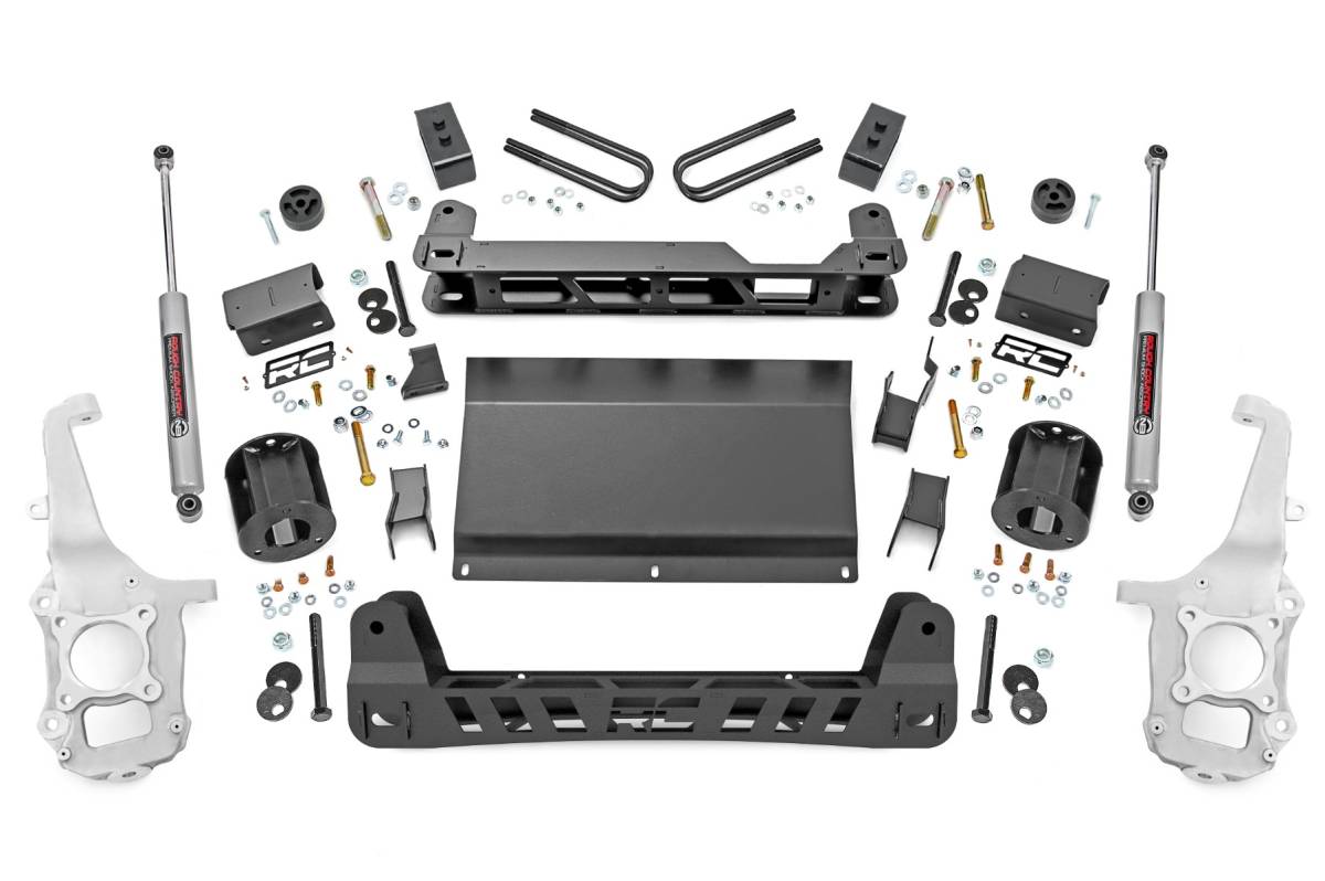 It's time to take your Ford F-150 Tremor up a notch! Give your Tremor aggressive good looks and superior ride quality with Rough Country's 4 Inch Lift Kit. This kit will provide increased ground clearance and levels the front with the rear of your ride. So, whether you're hitting the trails or just cruising around town, this lift kit will have you covered. Heavy-duty and reliable. Rough Country's 4in Lift Kit for the Ford F-150 Tremor is engineered with high-quality heavy-duty steel components. Featuring a set of durable lifted knuckles and strut spacers, you'll gain enough ride height to run up to 35-inch tires with proper wheel spacing! A 1/4-inch thick plate steel front and rear cross member bring uncompromised strength and good looks to your truck. Our fabricated blocks are stronger and offer a longer lifespan than cast blocks, and track width remains the same as factory. So, you can be sure your truck will look good - and perform even better. Installation. Featuring a 100% bolt-on installation process for an easy, no-fuss assembly. With an estimated install time of 8-10 hours, this kit can be installed at home using standard tools. Limited Lifetime Replacement Warranty. Rough Country's 4" Lift Kit is backed with a limited lifetime replacement warranty towards manufacturer defects. As such, the product is protected from structural and workmanship damage after the date of purchase. With our industry-leading warranty give yourself peace of mind when using Rough Country's Suspension products!