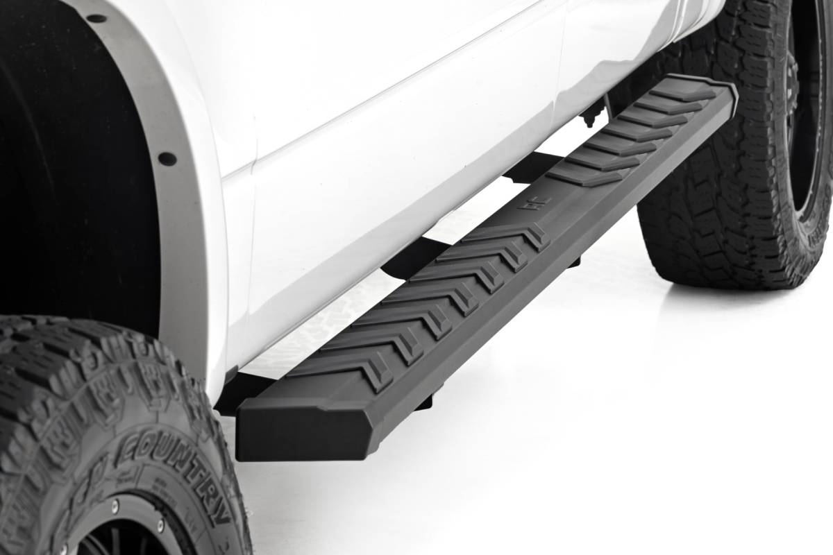 Ease of Access. Gain easier access to your cab with Rough Country's BA2 Running Board Side Steps. These high-quality replacements are a must-have for any lifted application. Offering a robust design and ample stepping area, your footing has never been safer. Durable Construction. Rough Country's BA2 Running Board Steps feature a comfortable, 5-inch wide stepping area with an integrated insert design that ensures foot placement when climbing in and out of your vehicle. Each running board features a durable powder-coated finish and a nonslip design that can support up to 500lbs! Installation. With no cutting or drilling required to install, installation couldn't be easier. With an estimated timeframe of 1-2 hours this full kit can be installed at home using standard tools and can be completed efficiently and quickly! 5-Year Replacement Warranty. Rough Country's BA2 Running Board Side Steps is backed with a five-year replacement warranty towards manufacturer defects. As such, the product is protected from structural and workmanship damage after the date of purchase. With our industry-leading warranty give yourself peace of mind when using Rough Country's Suspension products!