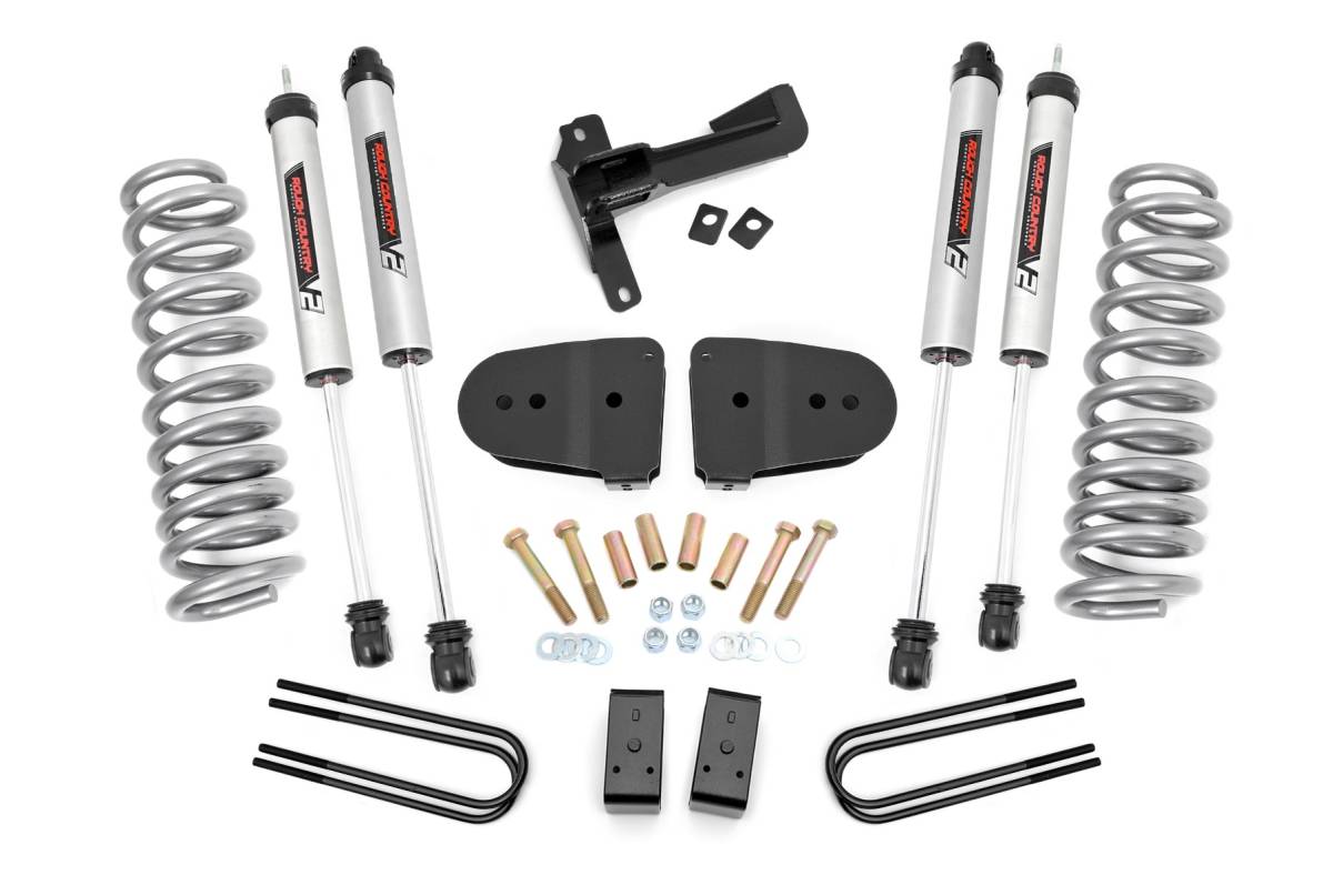 Bold Stance. Bolt-On Simplicity: Give your 5th gen Ford Super Duty a commanding upgrade with Rough Country's 3" Suspension Lift Kit. This all-in-one solution levels the front with the rear for a clean, aggressive stance while improving ride height and off-road capability. Best of all, installation is simple with a 100% bolt-on design, no cutting or grinding required. Ride High Without Compromise: This kit includes premium lifted coil springs designed to increase ground clearance without sacrificing comfort or handling. The springs are precision-engineered to maintain factory ride quality while providing the lift you need for tougher terrain and larger tires. Dialed-In Geometry and Handling: Included radius arm drop brackets and a track bar drop bracket ensure proper caster and suspension geometry, helping your Super Duty retain factory-like handling and drivability, even with the extra height. Premium Shock Options: This kit comes equipped with Rough Country's N3 shocks, 10-stage variable valving, nitrogen-charged performance, and a rugged 18mm chrome-hardened piston rod for durability and control. Want more? Upgrade to M1 monotube or V2 reservoir shocks to match your performance expectations. Ready for 35s: With increased clearance and included components, this kit gives you the freedom to run up to 35" tires with the proper wheel backspacing, so you can customize your Super Duty with the aggressive look and capability it deserves. Backed for the Long Haul: Like all Rough Country suspension products, this 3" Lift Kit is backed by our Limited Lifetime Replacement Warranty for total peace of mind.