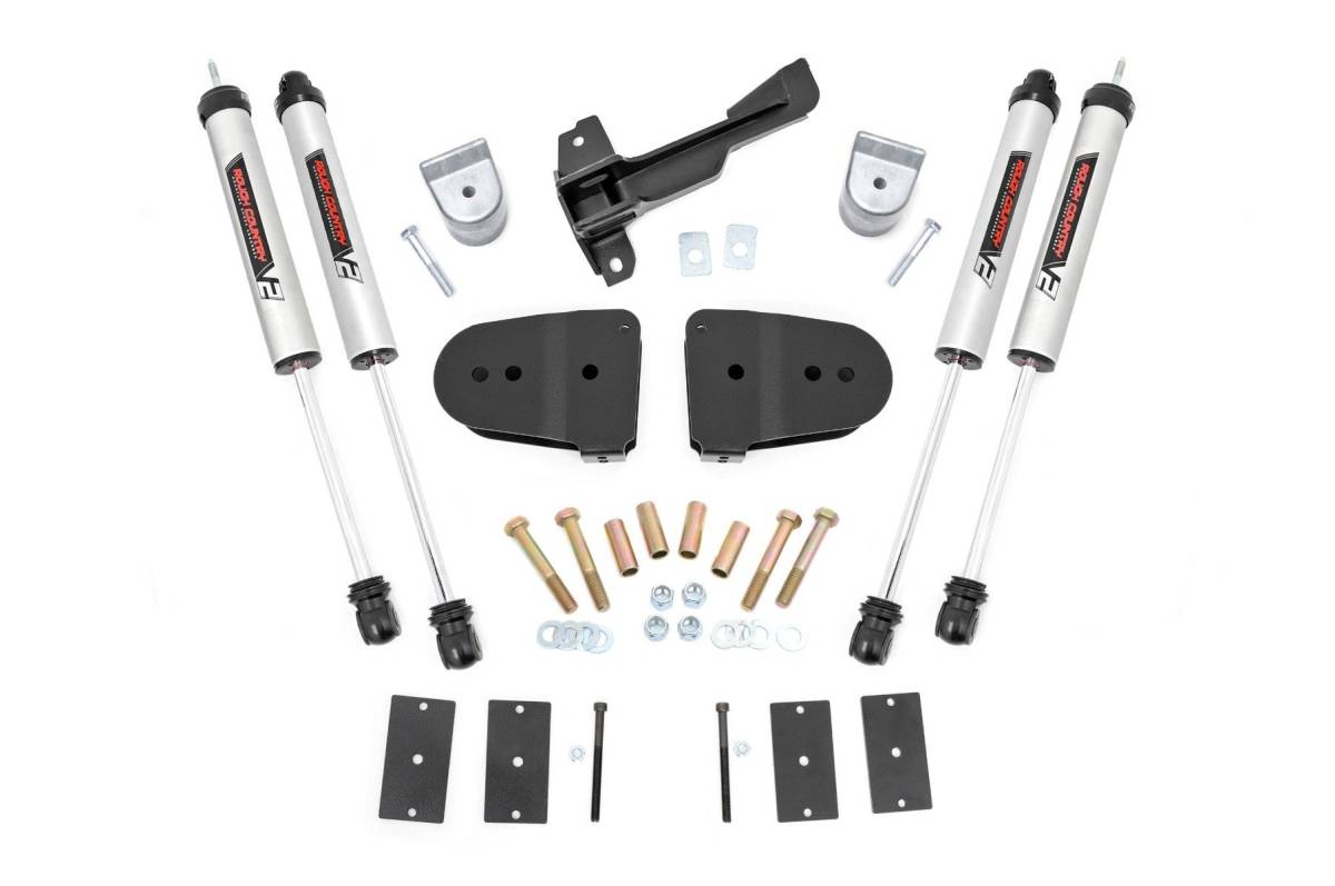 Superior Looks. Give your Ford Super Duty Tremor an impressive upgrade, front to back with Rough Country's 3" Suspension Lift Kit! This easy-to-install lift kit raises the front of your vehicle to be equal height with the rear for a leveled, better-than-stock look that gives an improved ride height and a more aggressive appearance. Durable Components. This kit features a set of front, lifted coil springs spacers allowing you to gain additional ride height without sacrificing ride quality or performance. A set of radius arm drop brackets as well as a track bar drop bracket is provided to keep everything at optimum angles for a factory-like ride, even after lifting. A set of Rough Country's premium V2 monotube shocks are also included. The V2 Monotube Shock Absorber is more than an upgrade - it s a true performance shock. Each shock features a T6061 brushed aluminum body with black anodized accents giving it a striking visual appearance that also dissipates heat faster than other materials. The internal 46mm high-flow piston offers countless years of durability. Installation. Requiring minor trimming to install, an estimated timeframe of 3-4 hours is recommended to complete this full installation. This full kit can be installed at home and can be completed efficiently and quickly! Limited Lifetime Replacement Warranty. Rough Country's 3-inch Suspension Lift Kit is backed with a limited lifetime replacement warranty towards manufacturer defects. As such, the product is protected from structural and workmanship damage after the date of purchase. With our industry-leading warranty give yourself peace of mind when using Rough Country's Suspension products!