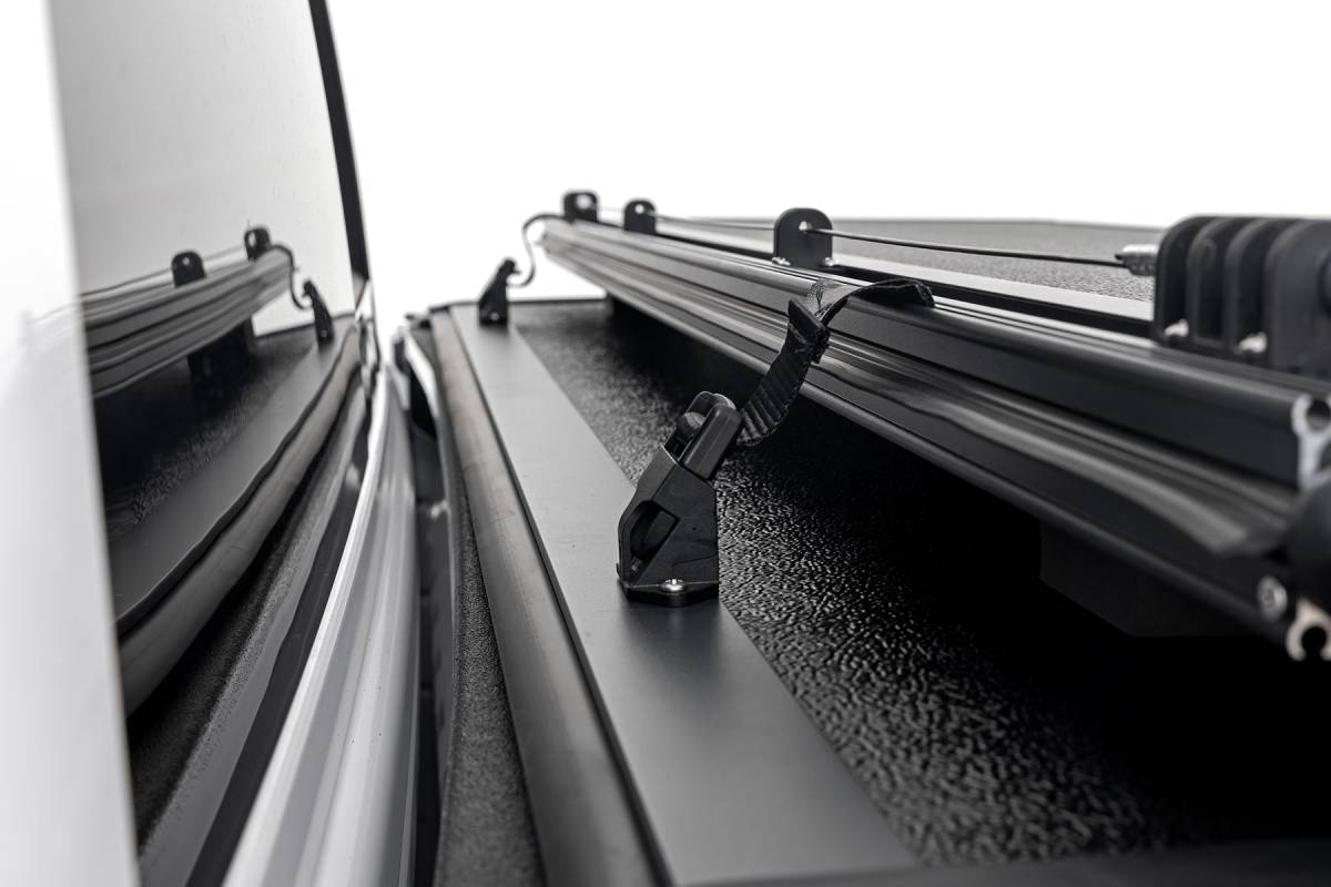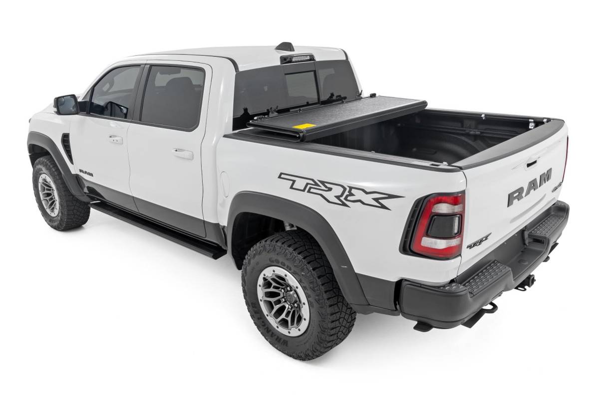 you'd rather be out on the trails than wrestling with instructions. That's why our Bed Cover is designed for a simple, hassle-free installation. You'll be cruising with newfound bed security in no time! Built to Last: Rough Country backs this tonneau cover with a 5-Year Warranty, so you can rest assured it's ready to conquer any adventure. Streamline your truck bed, secure your gear, and hit the trails with peace of mind. Rough Country's Hard Low-Profile Bed Cover is the perfect solution for those who demand both style and functionality. Rough Country's Hard Low-Profile Bed Cover is built for adventure. This tri-fold tonneau cover delivers a streamlined design that enhances your truck's off-road look while safeguarding your gear. Enjoy the peace of mind that comes with Rough Country's quality construction and easy access features. Here's what makes this tri-fold tonneau cover the ultimate winner: Low Profile, Sleek Look: Ditch the bulky covers! Our low-profile design seamlessly integrates with your truck bed, adding a touch of style without sacrificing function. Folds for Easy Access: Need to grab your gear in a hurry? No sweat! This tri-fold design lets you open the cover partially or fully in seconds, so you can access your truck bed whenever you need to. Extra Security: Worried about leaving your tools or weekend essentials behind? This cover integrates with your truck's tailgate lock, so you can relax knowing your gear is safe from prying eyes. Easy Does It Installation: We get it