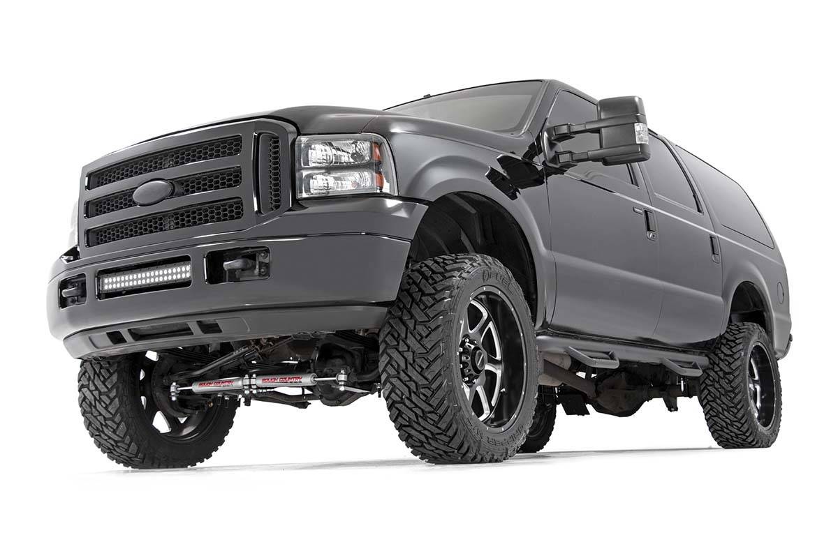 Level your 00-05 Ford Excursion from front to rear quickly and easily with Rough Country's 2-inch Leveling kit! This awesome upgrade features a front mini leaf spring lift, offering enough additional clearance to run up to 33x12.50 tires. Give your Excursion a killer new profile! From the factory, the Excursion has a front rake, leaving the vehicle with a nose-down look. This simple kit raises the front to be equal height with the rear, immediately giving your SUV a commanding presence and killer good looks. This easy to install leveling kit features a 100% bolt-on installation process, with no cutting or drilling required. This kit can be installed with common tools in a home garage! Best of all, this kit features Rough Country's lifetime replacement warranty!