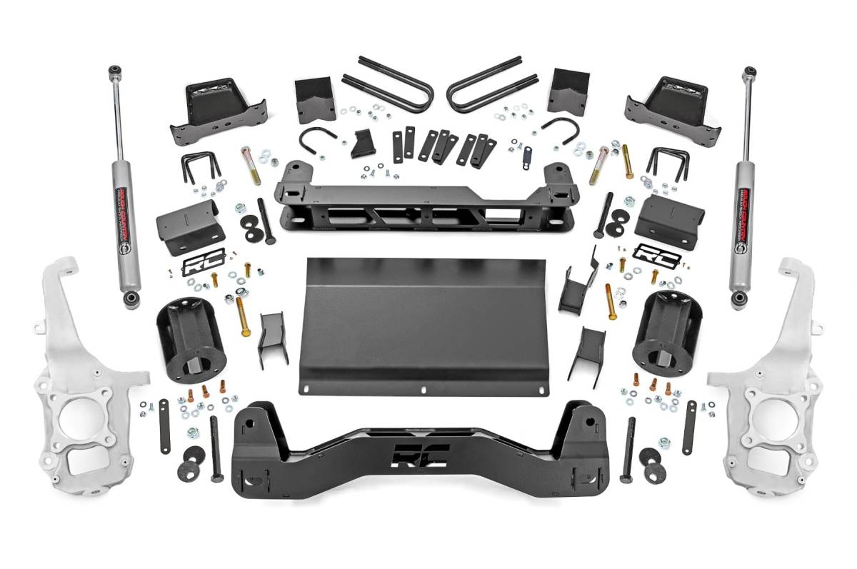 Fabricated Rear Blocks: Tougher than cast alternatives, these anti-axle wrap blocks keep your truck steady and reliable, mile after mile. Installation and Warranty: Transform your F-150 with our all-inclusive 6-inch Lift Kit, featuring durable aluminum knuckles, a skid plate, and all the hardware for a factory-like setup with extra ground clearance. Plus, enjoy peace of mind with Rough Country's limited lifetime warranty, protecting against structural and workmanship defects. This isn't your average lift kit. With premium components and attention to detail, it's designed to handle everything from weekend overlanding to weekday commutes. The lightweight knuckles enhance steering, while the skid plate provides unbeatable protection. Plus, we didn't skimp on style-your F-150 will stand taller, ride smoother, and look downright awesome. Turn your Ford F-150 into the ultimate road-and-trail champion with Rough Country's 6-Inch Lift Kit. Designed to conquer everything from rugged trails to your daily drive, this kit delivers the perfect stance, unbeatable ground clearance, and the confidence to tackle any challenge. It enhances ride quality while giving your truck the bold, capable look your adventures demand. This isn't just a lift-it's a complete truck upgrade. Serious Ground Clearance: More room for adventure! This lift gives your F-150 the height it needs to clear obstacles on the trail and look commanding on the road. Levels Front and Rear: Say farewell to that factory nose-down look. This kit evens things out, giving your truck a clean, aggressive stance that screams confidence. Precision Engineered Aluminum Knuckles: A standout feature you won't find with any other brand. Engineered to outperform steel, these knuckles are 50% lighter, delivering improved handling and a better ride quality. Outstanding corrosion resistance ensures superior performance and long-lasting durability, making them the ultimate choice for any terrain. Customizable Shock Options: Take control of your ride with Rough Country's 6-Inch Lift Kit, offering a range of shock options to match your off-road needs. Choose from the durable nitrogen-charged N3 shocks or upgrade to the high-performance Vertex reservoir shocks for maximum control on tough terrain. The choice is yours for the ultimate off-road experience. Durable Protective Skid Plate: Rocks? Debris? Bring it on. The included skid plate shields your truck's underside from trail hazards, keeping your investment safe while you play hard.