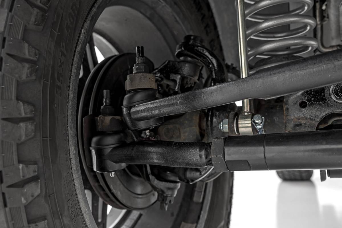 Fits stock through 6" of suspension lift. Models at stock height through 2.5" of suspension lift will need to install the drag link to the bottom side of the pitman arm. Ball joint must be greased prior to use. Factory pitman arm or OE replacement arm and the use of a 3.5"-Up track bar bracket is required for the high steer kit option. Cannot run a drop pitman arm. Factory steering stabilizer must be removed prior to installation. Kit includes components for stabilizer mounting, stabilizer sold separately. Due to the oversized tie rod this kit does NOT work with Rough Country dual steering stabilizer kits.