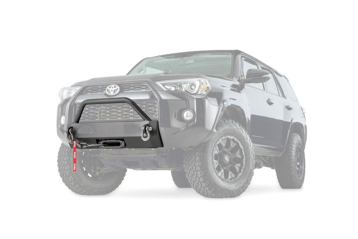 SEMI-HIDDEN WINCH MOUNT FOR TOYOTA 4RUNNERMounts WARN ZEON or VR EVO winch onto front of the Toyota 4Runner. Removes the vulnerable center section of the front bumper cover and replaces with heavy duty winch mount while retaining the factory appearance. With grille guard tube.
