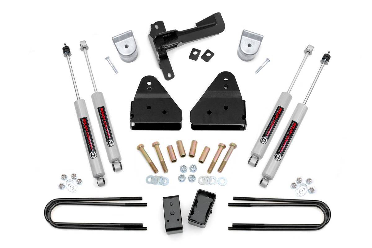 Give your 05-07 Ford Super Duty an impressive upgrade, front to back with Rough Country's 3" Ford Suspension Lift Kit! This easy-to-install lift kit raises the front of your vehicle to be equal height with the rear for a leveled, better-than-stock look that gives an improved ride height and more aggressive appearance. This kit features a set of front, lifted coil spacers allowing you gain additional ride height without sacrificing ride quality or performance. A set of radius arm drop brackets as well as a track bar drop bracket are provided to keep everything at optimum angles for a factory-like ride, even after lifting. A set of Rough Country's premium N3 shocks are also included. These fine tuned 10-stage variable high-pressure Nitrogen charged shocks offer a fantastic blend of off-road action and smooth highway ride quality. With a durable 18mm spring-loaded piston rod and faster-cooling 54mm shock body. Get the wheels you want! Rough Country's 3" Suspension Lift Kit comes with everything you need to fit up to a 35" tire with proper wheel backspacing. Best of all, Rough Country's 3" Suspension Lift Kit is backed by our Lifetime Replacement Warranty.