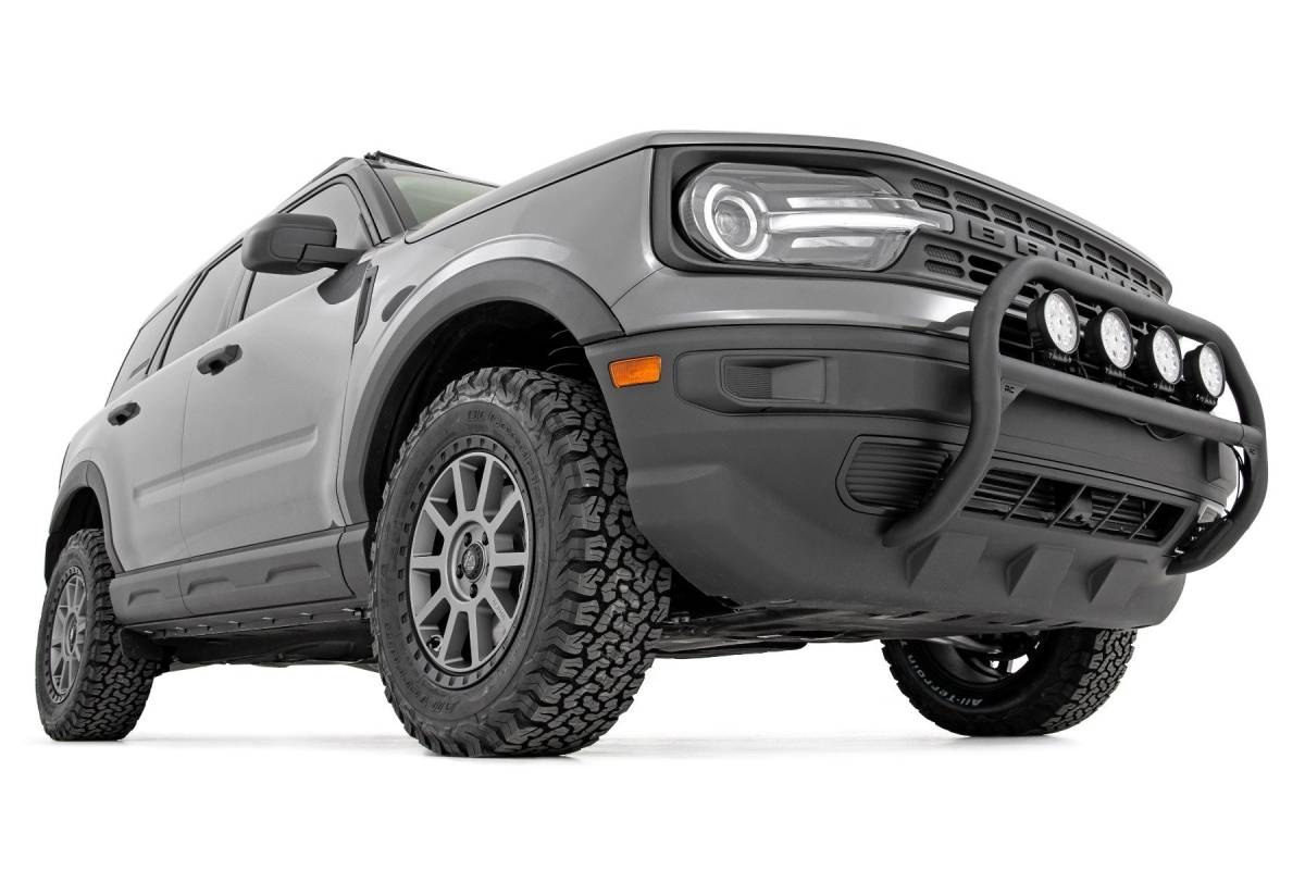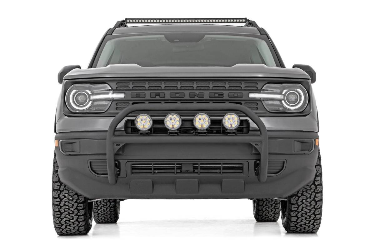 Outfit your 2021 Bronco Sport right with Rough Country's Nudge bar. This durable 3-inch thick tubular steel bull bar provides unbeatable protection for the front side of your vehicle all while offering multiple LED mounting solutions to provide ample lighting for the trail ahead. This easy-to-install bull bar features a 100% bolt-on installation process, giving you a simple way to add this eye-catching upgrade that provides protection from hazards on and off-road. Each Nudge Bar is coated with corrosion-resistant black powder coat to ensure a long-lifespan for years to come. Rough Country's Nudge Bar can be equipped with four round LED lights, or a single row 20" LED light bar! Rough Country's all-weather LED lights feature a durable, die-cast aluminum housing and include a premium, waterproof, flat-wound, braided wiring harness with toggle switch and in-line fuse.