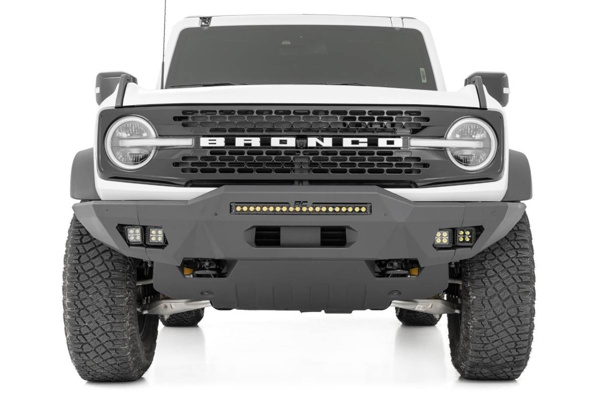 Add an Aggressive Style. Looking to add some attitude to your Bronco? Check out our Rough Country Front Bumper. This bumper will transform the appearance of your vehicle and protect your lights and engine from potential damage. Manufactured to be a perfect fit for your Bronco and provide maximum ground clearance, our bumper is designed to overlap the factory grille shell for looks and light bar fitment. Since it fits Rough Country's 20" light bars, with an option to add additional cube lighting on the side, you can upgrade your visibility at night and give your vehicle a touch of style. Modular Design. Rough Country's High Clearance Bumper Kit is modular, letting you pick and choose the options you prefer. Spanning the line of our high-quality black series LED light bars and LED cube lights, YOU can decide the combination that best suits your needs! Boasting an impressive 14,400 lumens of combined lighting power you're sure to see the trails on your next outing. Each bumper features high clearance full wings that provide additional protection when tackling the trails! Installation. Requiring minor splicing, an estimated timeframe of 3-4 hours is suggested to complete the installation process. With the included step-by-step instructions this high-quality unit can be assembled and installed at home! Limited Lifetime Replacement Warranty. Rough Country's High Clearance Bumper Kit is backed with a limited lifetime replacement warranty towards manufacturer defects. As such, the product is protected from structural and workmanship damage after the date of purchase. With our industry-leading warranty give yourself peace of mind when using Rough Country's Suspension products!