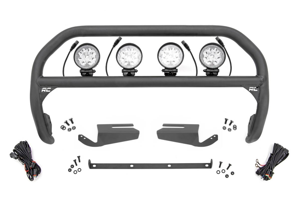 Innotative Design. Outfit your Ford Bronco right with Rough Country's Nudge Bar. This durable 2-inch thick tubular steel bull bar provides unbeatable protection for the front side of your vehicle all while offering multiple LED mounting solutions to provide ample lighting for the trail ahead. Durable Upgrade. Each Nudge Bar is coated with a corrosion-resistant black powder coat to ensure a long lifespan for years to come. Rough Country's Nudge Bar can be equipped with four round LED lights, or a single row 20" LED light bar! Rough Country's all-weather LED lights feature a durable, die-cast aluminum housing and include a premium, waterproof, flat-wound, braided wiring harness with a toggle switch and in-line fuse. Installation & Warranty. Featuring a 100% bolt-on installation process an estimated timeframe of 3-4 hours is predicted to complete the installation process. This full kit can be installed and can be completed efficiently and quickly! Rough Country's Nudge Bar is backed with a limited lifetime replacement warranty towards manufacturer defects. As such, the product is protected from structural and workmanship damage after the date of purchase. With our industry-leading warranty give yourself peace of mind when using Rough Country's Suspension products!