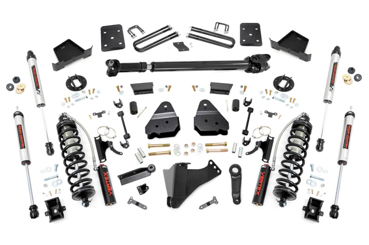 Explore New Heights. Give your fourth-generation Ford Super Duty superior lift height with Rough Country's 6-inch Coilover Suspension Lift Kit! This all-inclusive kit comes with everything you need for a total transformation of your truck. Run up to 37in tires while preserving the smooth, factory ride quality with this impressive upgrade. Durable Components. When changing a vehicle's suspension, the key to preserving ride quality is keeping the geometry of all suspension components as close to their factory angles as possible. Rough Country's new 6-inch Suspension Lift features a set of ultra-durable radius arm drop brackets, precision fit to bolt right into the factory mounts for an easier install and a more factory-like angle. Utilizing this conversion kit you're removing the factory independent coil shock and coil set-up and replacing it with a massive 2.5in piston, nitrogen-charged, 8-stage adjustable Vertex Coilover. Rough Country's Vertex Coilovers feature a monotube design with an external reservoir for increased oil capacity and damping sensitivity. When it comes to investing in a high-end kit, you ll be pleased to find that Rough Country's 2.5in piston design is beefier and offers an impressive 56% greater fluid capacity than the average reservoir shock. Each kit is paired with a monotube shock that provides optimal damping control. Installation. Requiring cutting and drilling to install, an estimated timeframe of 6-10 hours is recommended to complete this full installation. This full kit can be installed at home and can be completed efficiently and quickly! Limited Lifetime Replacement Warranty. Rough Country's 6-inch Coilover Suspension Lift Kit is backed with a limited lifetime replacement warranty towards manufacturer defects. As such, the product is protected from structural and workmanship damage after the date of purchase. With our industry-leading warranty give yourself peace of mind when using Rough Country's Suspension products!