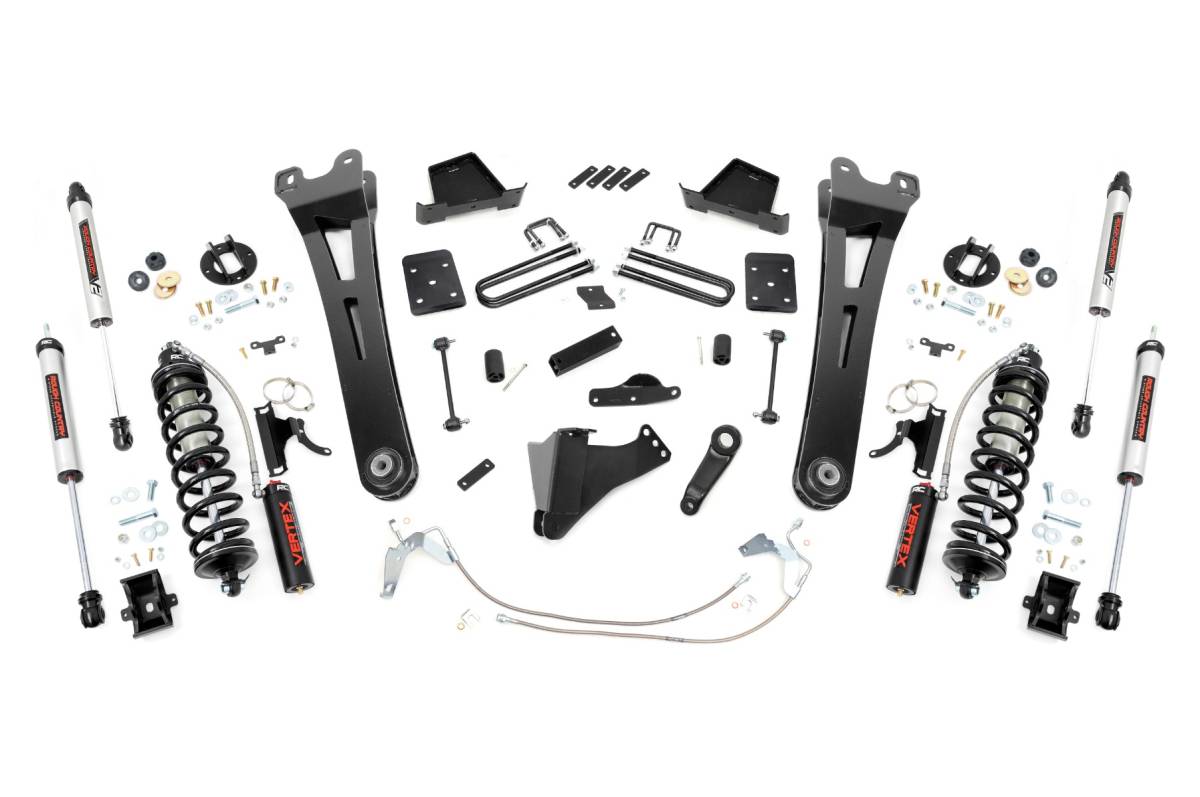 Superior Ride Quality. Take your second-generation Ford Super Duty to new heights with Rough Country's 6-inch Radius Arm Coilover Conversion Suspension Lift! This all-inclusive kit comes with everything you need for a total transformation of your truck. Run up to 37in tires while preserving the smooth, factory ride quality with this impressive upgrade. Durable Components. When changing a vehicle's suspension, the key to preserving ride quality is keeping the geometry of all suspension components as close to their factory angles as possible. Rough Country's new 6-inch Radius Arm Suspension Lift features a set of ultra-durable Radius Arms, precision fit to bolt right into the factory mounts for an easier install and a more factory-like angle. At 27lbs each, these beefy, upgraded Radius Arms dwarf stock equipment and feature durable rubber bushings for maximum vibration absorption. Rough Country's 6" Radius Coilover Conversion Lift Kit features top-mounted reservoir brackets and coil-over mounts constructed from 1/4-inch steel. Utilizing this conversion kit you're removing the factory independent coil shock and coil set-up and replacing it with a massive 2.5in piston, nitrogen-charged, 8-stage adjustable Vertex Coilover. Rough Country's Vertex Coilovers feature a monotube design with an external reservoir for increased oil capacity and damping sensitivity. When it comes to investing in a high-end kit, you ll be pleased to find that Rough Country's 2.5in piston design is beefier and offers an impressive 56% greater fluid capacity than the average reservoir shock. Each kit is paired with a monotube shock that provides optimal damping control. Installation. Requiring cutting and drilling to install, an estimated timeframe of 6-10 hours is recommended to complete this full installation. This full kit can be installed at home and can be completed efficiently and quickly! Limited Lifetime Replacement Warranty. Rough Country's 6-inch Radius Arm Coilover Conversion Suspension Lift Kit is backed with a limited lifetime replacement warranty towards manufacturer defects. As such, the product is protected from structural and workmanship damage after the date of purchase. With our industry-leading warranty give yourself peace of mind when using Rough Country's Suspension products!
