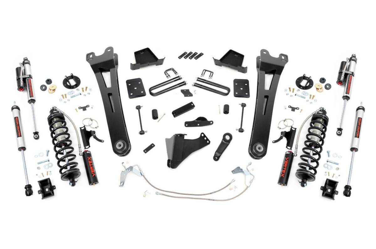 Superior Ride Quality. Take your second-generation Ford Super Duty to new heights with Rough Country's 6-inch Radius Arm Coilover Conversion Suspension Lift! This all-inclusive kit comes with everything you need for a total transformation of your truck. Run up to 37in tires while preserving the smooth, factory ride quality with this impressive upgrade. Durable Components. When changing a vehicle's suspension, the key to preserving ride quality is keeping the geometry of all suspension components as close to their factory angles as possible. Rough Country's new 6-inch Radius Arm Suspension Lift features a set of ultra-durable Radius Arms, precision fit to bolt right into the factory mounts for an easier install and a more factory-like angle. At 27lbs each, these beefy, upgraded Radius Arms dwarf stock equipment and feature durable rubber bushings for maximum vibration absorption. Rough Country's 6" Radius Coilover Conversion Lift Kit features top-mounted reservoir brackets and coil-over mounts constructed from 1/4-inch steel. Utilizing this conversion kit you're removing the factory independent coil shock and coil set-up and replacing it with a massive 2.5in piston, nitrogen-charged, 8-stage adjustable Vertex Coilover. Rough Country's Vertex Coilovers feature a monotube design with an external reservoir for increased oil capacity and damping sensitivity. When it comes to investing in a high-end kit, you ll be pleased to find that Rough Country's 2.5in piston design is beefier and offers an impressive 56% greater fluid capacity than the average reservoir shock. Each kit is paired with a monotube shock that provides optimal damping control. Installation. Requiring cutting and drilling to install, an estimated timeframe of 6-10 hours is recommended to complete this full installation. This full kit can be installed at home and can be completed efficiently and quickly! Limited Lifetime Replacement Warranty. Rough Country's 6-inch Radius Arm Coilover Conversion Suspension Lift Kit is backed with a limited lifetime replacement warranty towards manufacturer defects. As such, the product is protected from structural and workmanship damage after the date of purchase. With our industry-leading warranty give yourself peace of mind when using Rough Country's Suspension products!