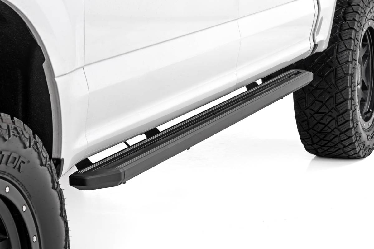 Revolutionize the way you step into your truck with Rough Country's Bluetooth-Controlled Running Boards! Designed for those who demand both cutting-edge technology and rugged durability, these premium running boards combine wireless convenience, customizable LED lighting, and rock-solid construction into one sleek package. Whether you're looking for enhanced accessibility, extra protection, or a bold new look, these running boards deliver the perfect blend of functionality and style-all at the touch of a button. Wireless Control at Your Fingertips: Step into the future with Bluetooth-controlled running boards that offer seamless access and fully customizable LED lighting. With a simple app-based control, you can adjust step settings and personalize lighting effects effortlessly. Built Tough with Premium Aluminum: Designed for durability, these one-piece aluminum running boards are lightweight, corrosion-resistant, and ready for any terrain. The sleek cab-length design provides full coverage while protecting your truck from road debris and rock chips. Custom Lighting Like Never Before: Express your style with 234 color options, 12 dynamic effects, and five preset color saves. The integrated LED strip and RC puddle lights enhance visibility for safer nighttime entry and exit, while the adjustable step lighting lets you set the perfect delay from 1 second to 10 minutes. Seamless Fit for Any Setup: Whether your truck has a body lift or not, these running boards are engineered for a perfect fit. The sleek frame coverage also conceals exposed components for a clean, factory-like finish. Easy, Bolt-On Installation: No need for complex modifications-these running boards feature a hassle-free, drill-free installation so you can get back on the road fast. Designed for convenience, strength, and style, they're the ultimate upgrade for your truck. Backed by Rough Country's Leading Warranty: With a Limited Lifetime Warranty, these running boards are built to last. Whether you're hitting the trails or cruising the streets, you'll have peace of mind knowing your investment is protected.