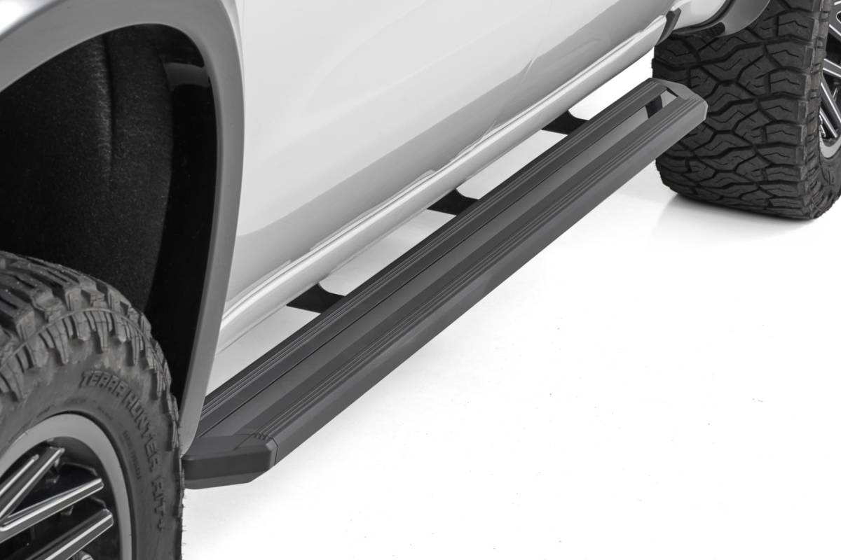 Revolutionize the way you step into your truck with Rough Country's Bluetooth-Controlled Running Boards! Designed for those who demand both cutting-edge technology and rugged durability, these premium running boards combine wireless convenience, customizable LED lighting, and rock-solid construction into one sleek package. Whether you're looking for enhanced accessibility, extra protection, or a bold new look, these running boards deliver the perfect blend of functionality and style-all at the touch of a button. Wireless Control at Your Fingertips: Step into the future with Bluetooth-controlled running boards that offer seamless access and fully customizable LED lighting. With a simple app-based control, you can adjust step settings and personalize lighting effects effortlessly. Built Tough with Premium Aluminum: Designed for durability, these one-piece aluminum running boards are lightweight, corrosion-resistant, and ready for any terrain. The sleek cab-length design provides full coverage while protecting your truck from road debris and rock chips. Custom Lighting Like Never Before: Express your style with 234 color options, 12 dynamic effects, and five preset color saves. The integrated LED strip and RC puddle lights enhance visibility for safer nighttime entry and exit, while the adjustable step lighting lets you set the perfect delay from 1 second to 10 minutes. Seamless Fit for Any Setup: Whether your truck has a body lift or not, these running boards are engineered for a perfect fit. The sleek frame coverage also conceals exposed components for a clean, factory-like finish. Easy, Bolt-On Installation: No need for complex modifications-these running boards feature a hassle-free, drill-free installation so you can get back on the road fast. Designed for convenience, strength, and style, they're the ultimate upgrade for your truck. Backed by Rough Country's Leading Warranty: With a Limited Lifetime Warranty, these running boards are built to last. Whether you're hitting the trails or cruising the streets, you'll have peace of mind knowing your investment is protected.