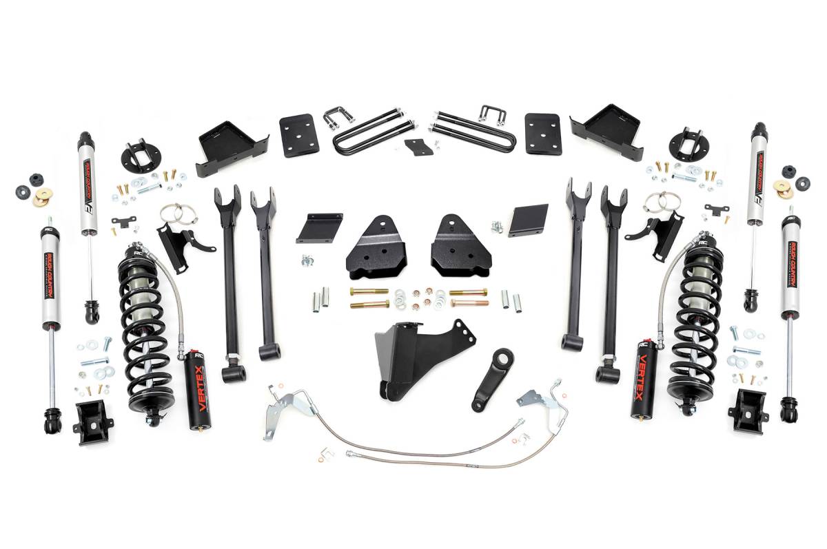 Superior Ride Quality. Give your third-generation Ford Super Duty an impressive upgrade and incredible ride quality with Rough Country's 4-Link Coilover Conversion Lift Kit! This must-have kit is the pinnacle of suspension upgrades. Providing ride height adjustability, increased dampening, and killer good looks. You're sure to set yourself apart from the pack. This innovative kit allows you to replace your factory arms with a 4-Link setup, using Rough Country's durable, fixed upper arms and adjustable lower control arms. A set of radius arm drop brackets maintain proper geometry and allow for proper caster setting, which is crucial to maintaining factory handling. Durable Components. Rough Country's 6" 4-Link Coilover Conversion Lift Kit features top-mounted reservoir brackets and coil-over mounts constructed from 1/4-inch steel. Utilizing this conversion kit you're removing the factory independent coil shock and coil set-up and replacing it with a massive 2.5in piston, nitrogen-charged, 8-stage adjustable Vertex Coilover. Rough Country's Vertex Coilovers feature a monotube design with an external reservoir for increased oil capacity and damping sensitivity. When it comes to investing in a high-end kit, you ll be pleased to find that Rough Country's 2.5in piston design is beefier and offers an impressive 56% greater fluid capacity than the average reservoir shock. Each kit is paired with a monotube shock that provides optimal damping control. Installation. Requiring cutting and drilling to install, an estimated timeframe of 6-10 hours is recommended to complete this full installation. This full kit can be installed at home and can be completed efficiently and quickly! Limited Lifetime Replacement Warranty. Rough Country's 4-Link Coilover Conversion Lift Kit is backed with a limited lifetime replacement warranty towards manufacturer defects. As such, the product is protected from structural and workmanship damage after the date of purchase. With our industry-leading warranty give yourself peace of mind when using Rough Country's Suspension products!