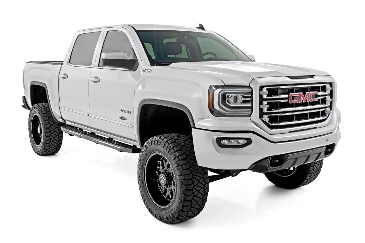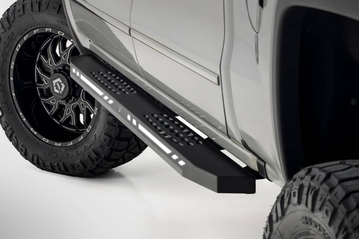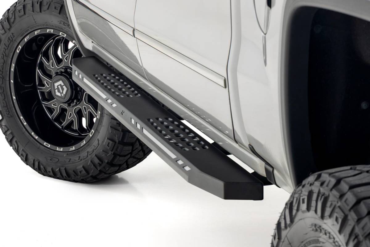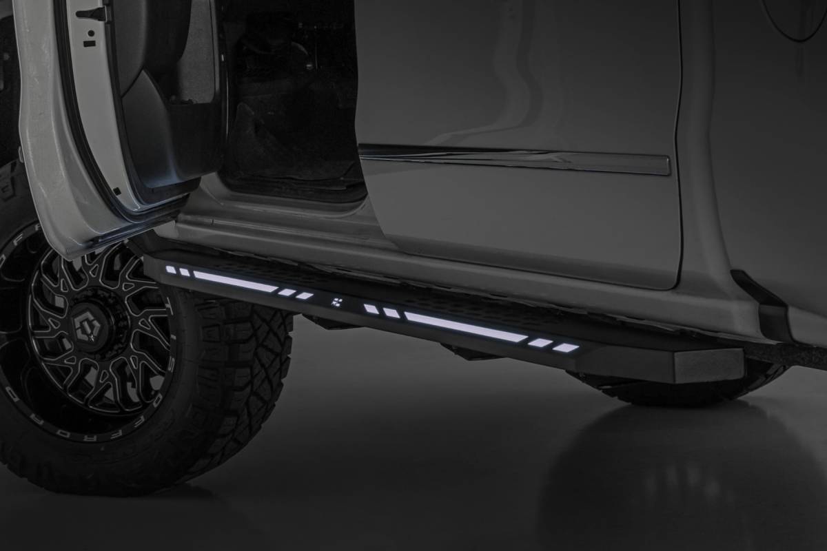 Aggressive Style Meets Everyday Functionality: Upgrade your truck's look and performance with Rough Country's AC2 Running Boards. These premium cab-length steps combine rugged durability, modern styling, and practical convenience in one sleek package. Built for Strength and Style: Crafted from heavy-duty, one-piece aluminum, the AC2 Running Boards deliver exceptional strength without the weight. A black powder-coated finish offers superior corrosion resistance, shielding against rust, wear, and harsh weather. Maximum Accessibility: Easily enter and exit your truck thanks to the wide step surface and lowered profile, perfect for lifted vehicles or daily drivers alike. The cab-length design offers full coverage and enhances your truck's side profile with clean, aggressive lines. Integrated Illumination: Stay visible and stand out with built-in LED lighting. Customizable LED Output lets you choose between amber or white via an internal switch, while Automatic Activation engages the lights when your door opens, thanks to a built-in magnetic sensor. Enhanced Protection and Clean Looks: The AC2 boards also provide a barrier against road debris, rock chips, and mud while covering up exposed frame components for a seamless, finished appearance. Body Lift Compatible: No need to worry about aftermarket modifications, these boards are fully compatible with or without a body lift, ensuring a perfect fit across various setups. Hassle-Free Installation: Install with ease using Rough Country's simple, bolt-on design. No cutting, welding, or drilling required. Warranty You Can Trust: Backed by Rough Country's Limited Lifetime Warranty on structural components and a 1-year warranty on the finish for total peace of mind.