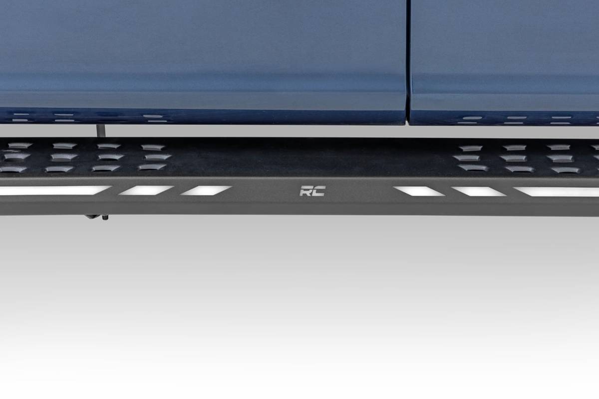 Aggressive Style Meets Everyday Functionality: Upgrade your truck's look and performance with Rough Country's AC2 Running Boards. These premium cab-length steps combine rugged durability, modern styling, and practical convenience in one sleek package. Built for Strength and Style: Crafted from heavy-duty, one-piece aluminum, the AC2 Running Boards deliver exceptional strength without the weight. A black powder-coated finish offers superior corrosion resistance, shielding against rust, wear, and harsh weather. Maximum Accessibility: Easily enter and exit your truck thanks to the wide step surface and lowered profile, perfect for lifted vehicles or daily drivers alike. The cab-length design offers full coverage and enhances your truck's side profile with clean, aggressive lines. Integrated Illumination: Stay visible and stand out with built-in LED lighting. Customizable LED Output lets you choose between amber or white via an internal switch, while Automatic Activation engages the lights when your door opens, thanks to a built-in magnetic sensor. Enhanced Protection and Clean Looks: The AC2 boards also provide a barrier against road debris, rock chips, and mud while covering up exposed frame components for a seamless, finished appearance. Body Lift Compatible: No need to worry about aftermarket modifications, these boards are fully compatible with or without a body lift, ensuring a perfect fit across various setups. Hassle-Free Installation: Install with ease using Rough Country's simple, bolt-on design. No cutting, welding, or drilling required. Warranty You Can Trust: Backed by Rough Country's Limited Lifetime Warranty on structural components and a 1-year warranty on the finish for total peace of mind.