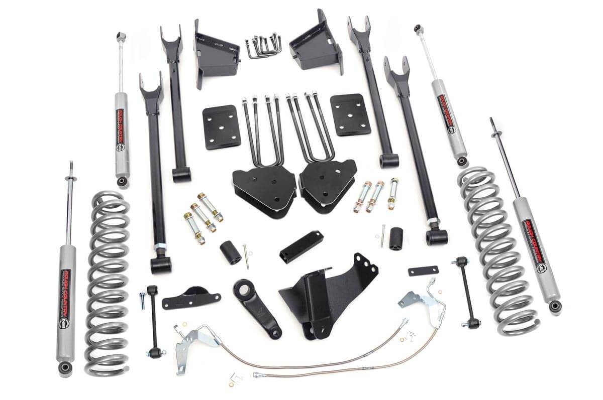 Compliment your 08-10 Ford F-250/350's aggressive, good looks with Rough Country's 4-Link Suspension Lift System. Rough Country's 8-inch Lift Kit was engineered to retain the F-250/350's impressive factory specs while bumping up performance and durability where it's needed most. The result is an aggressive, lifted beast with a mean profile and balanced on and off-road ride quality. When changing a vehicle's suspension, the key to preserving ride quality is in keeping the geometry of all suspension components as close to their factory angles as possible. Rough Country's 4-Link Suspension Lift System features a set of ultra-durable radius arm drop brackets, precision fit to bolt right into the factory mounts for an easier install and a more factory-like angle. This all-inclusive kit also features an adjustable lower control arms at the axle to allow caster adjustment as well as a track bar relocation bracket and a drop pitman arm. A full set of N3 Shocks provide a truly balanced ride quality for on and off-road use - prefect for daily drivers. This kit also ships with a set of durable, lifted coil springs and brake line relocation brackets. This innovative kit design features a 100% bolt-on installation process that is lightning fast compared to other kits this size. Save time and money with no need for cutting, drilling, or other complicated procedures. Rough Country's Rough Country's 4-Link Suspension Lift System is backed by our Lifetime Replacement Warranty.