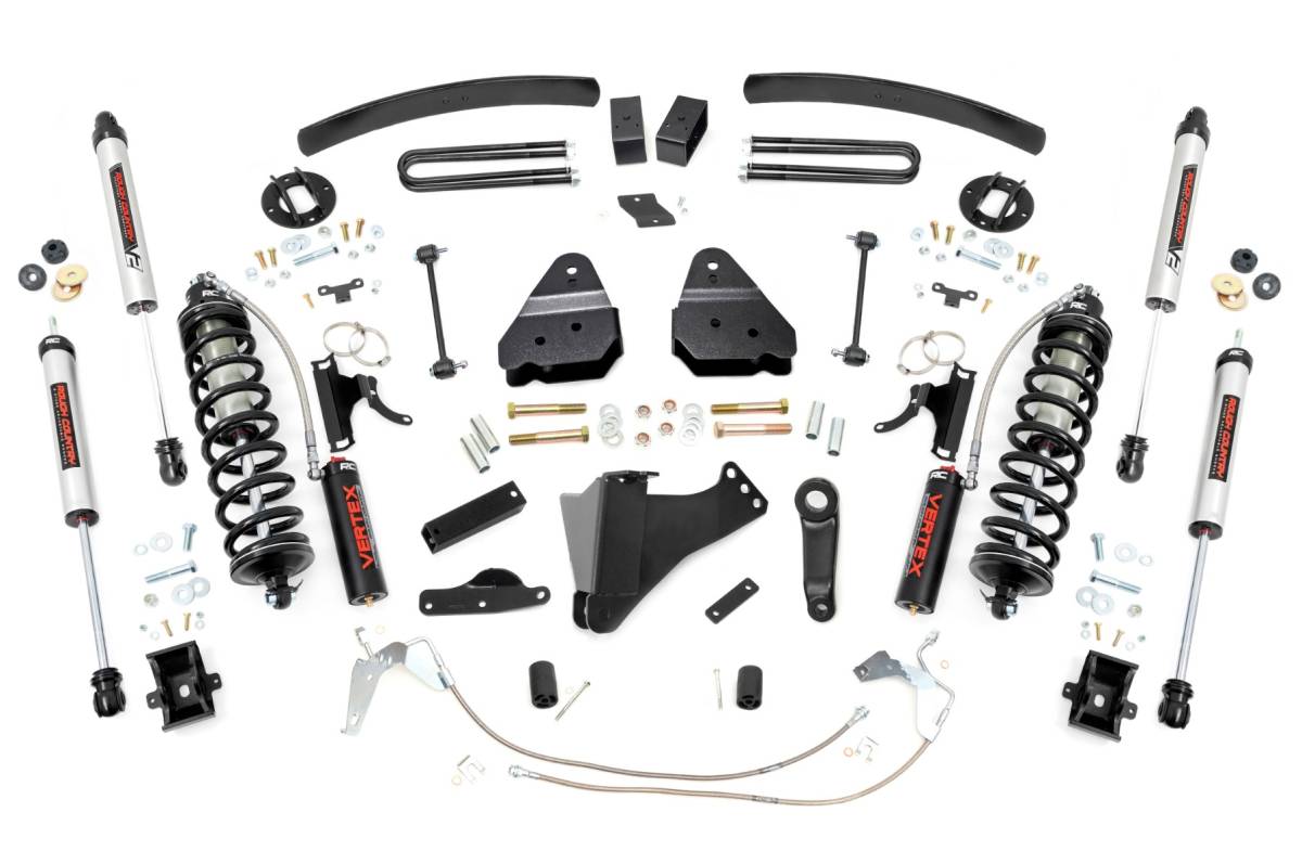 Explore New Heights. Give your second-generation Ford Super Duty superior lift height with Rough Country's 6-inch Coilover Suspension Lift Kit! This all-inclusive kit comes with everything you need for a total transformation of your truck. Run up to 37in tires while preserving the smooth, factory ride quality with this impressive upgrade. Durable Components. When changing a vehicle's suspension, the key to preserving ride quality is keeping the geometry of all suspension components as close to their factory angles as possible. Rough Country's new 6-inch Suspension Lift features a set of ultra-durable radius arm drop brackets, precision fit to bolt right into the factory mounts for an easier install and a more factory-like angle. Utilizing this conversion kit you're removing the factory independent coil shock and coil set-up and replacing it with a massive 2.5in piston, nitrogen-charged, 8-stage adjustable Vertex Coilover. Rough Country's Vertex Coilovers feature a monotube design with an external reservoir for increased oil capacity and damping sensitivity. When it comes to investing in a high-end kit, you ll be pleased to find that Rough Country's 2.5in piston design is beefier and offers an impressive 56% greater fluid capacity than the average reservoir shock. Each kit is paired with a monotube shock that provides optimal damping control. Installation. Requiring cutting and drilling to install, an estimated timeframe of 6-10 hours is recommended to complete this full installation. This full kit can be installed at home and can be completed efficiently and quickly! Limited Lifetime Replacement Warranty. Rough Country's 6-inch Coilover Suspension Lift Kit is backed with a limited lifetime replacement warranty towards manufacturer defects. As such, the product is protected from structural and workmanship damage after the date of purchase. With our industry-leading warranty give yourself peace of mind when using Rough Country's Suspension products!