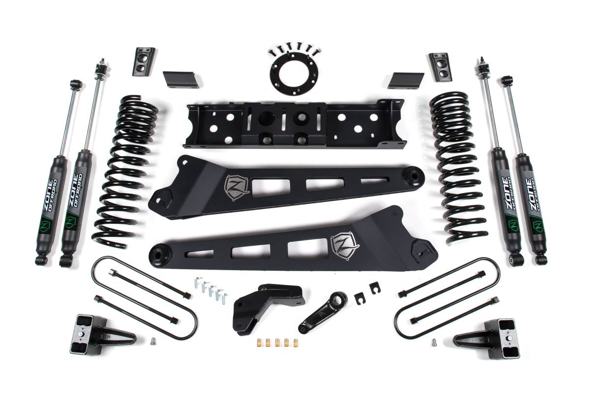 This 6.5-inch radius arm lift kit from Zone Offroad is designed for the 2019–2024 Ram 3500 4WD diesel. The kit includes full-length coil springs, heavy-duty radius arms, steering correction components, and rear lift hardware to level the truck's stance. It provides clearance for up to 37-inch tires.