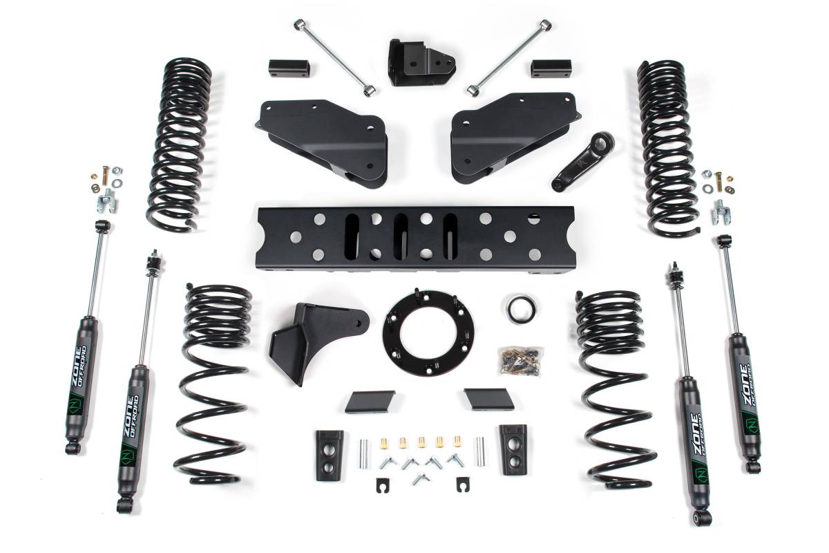 This 5.5 inch lift kit from Zone Offroad is designed for the Ram 2500 (2019–2026) 4WD Gas models. The kit includes everything needed for a complete lift, from full-length coil springs and radius arm drop brackets to steering correction and rear lift to level the stance. Clearance is provided for up to 37 inch tires.