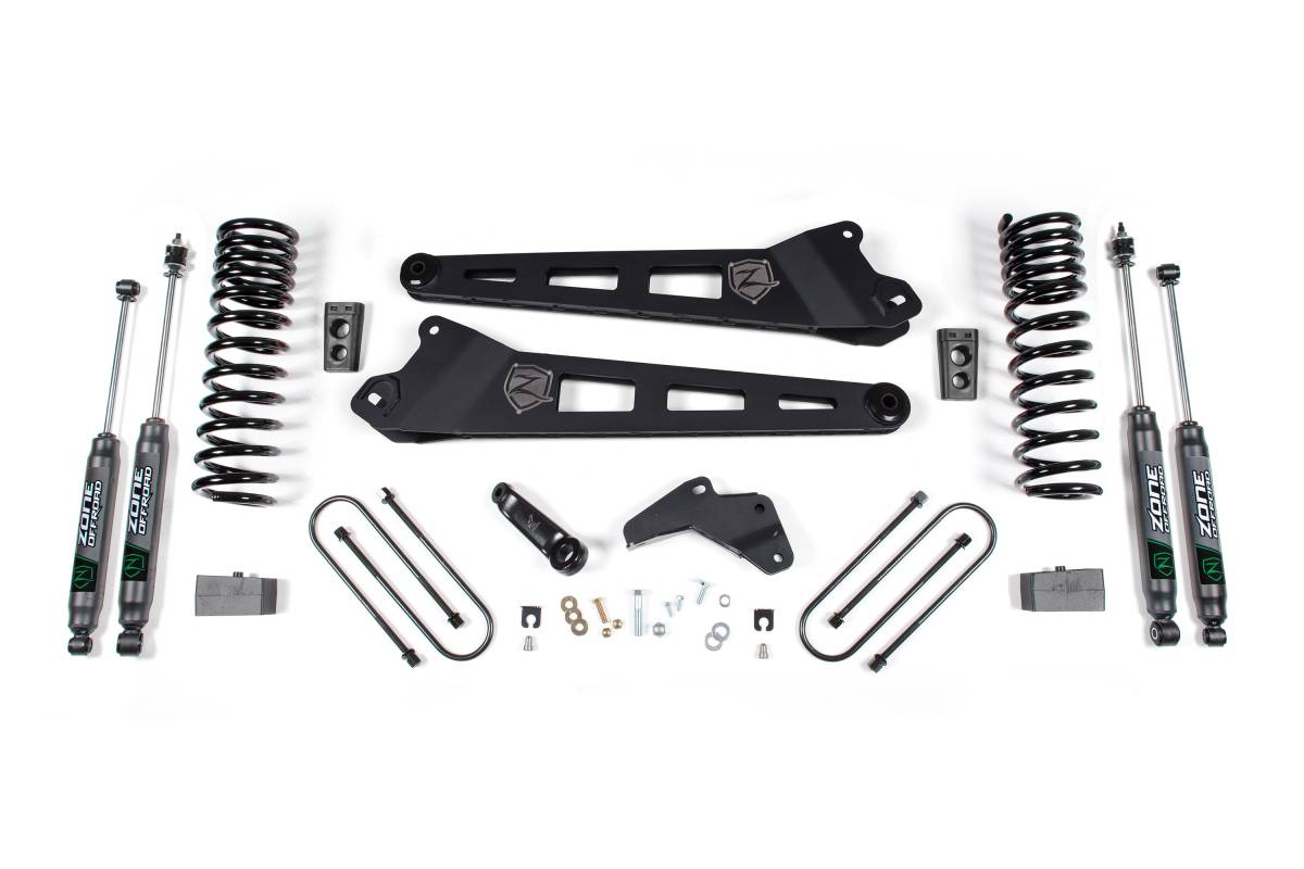 This 4-inch lift kit from Zone Offroad is designed for the 2013–2018 Ram 3500 4WD (6.4L gas engine). The kit includes everything needed to lift and level the truck, from full-length coil springs and heavy-duty radius arms to steering correction hardware and rear lift components, providing clearance for up to 37-inch tires.