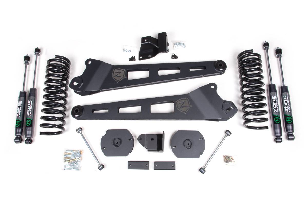 Zone Offroad's 3-inch Radius Arm Lift Kit is engineered for 2019–2024 RAM 2500 4WD diesel trucks. Designed to lift and level the stance, these systems add strength with high-strength replacement radius arms, progressive rate coil springs, and gas shocks, while providing clearance for up to 35-inch tires. All Zone Offroad kits are backed by Factory Protection Plus.