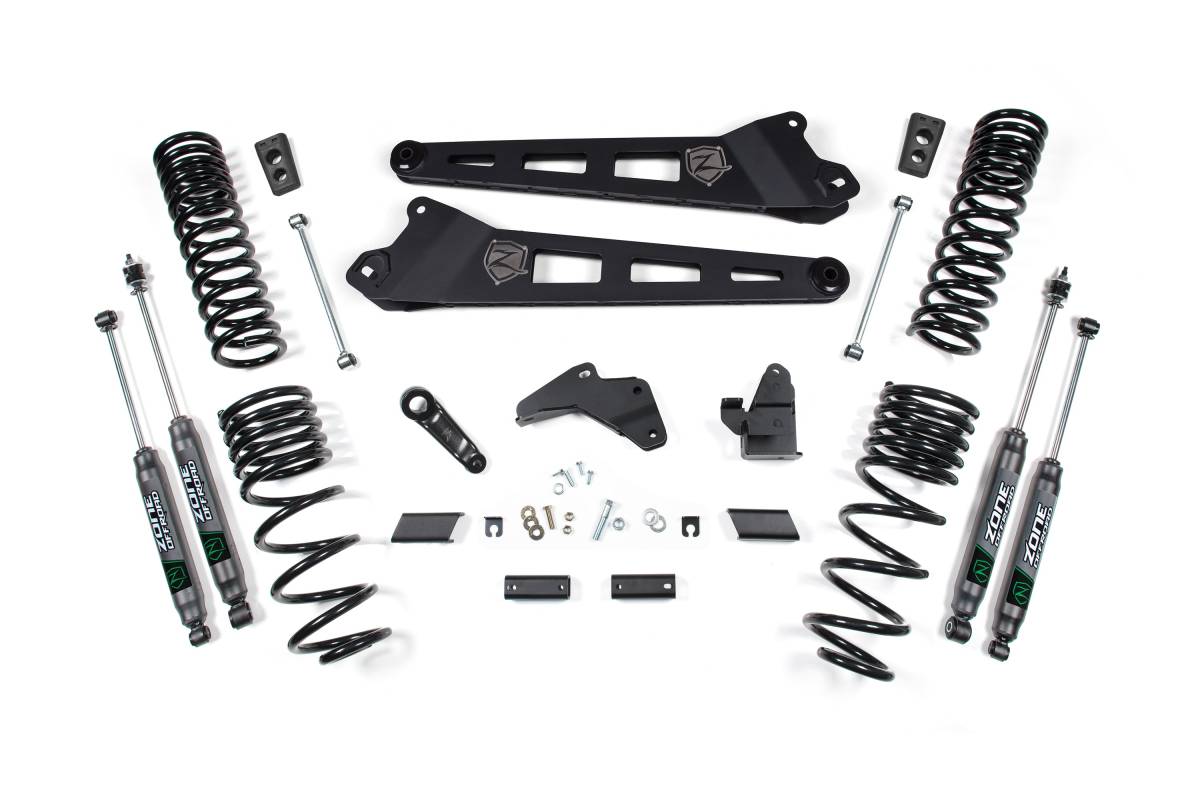 This 5.5-inch lift kit from Zone Offroad is designed for the 2014–2018 Ram 2500 4WD Gas. The kit includes everything needed to lift and level the stance, from front and rear coil springs and heavy-duty radius arms to steering correction components and rear lift hardware. Clearance is provided for up to 37-inch tires.