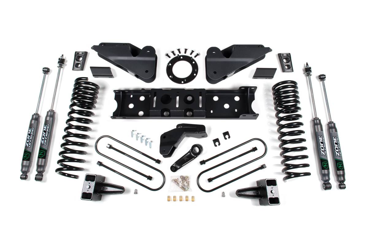 This 4.5 inch lift kit from Zone Offroad is designed for 2019–2024 Ram 3500 4WD diesel trucks. The kit includes everything needed to raise the front and rear of the truck, from full-length coil springs and radius arm relocation brackets to steering correction components and rear block lift. Clearance for up to 37 inch tires is achievable with this kit.