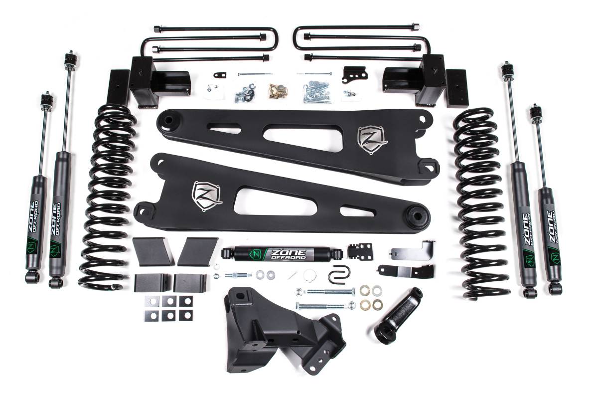 This 4-inch lift kit from Zone Offroad is designed for 2017–2019 Ford F-250/F-350 Super Duty 4WD gas trucks. The kit can be configured with radius arm drop brackets or upgraded to Zone HD Radius Arms for additional strength and durability. Everything needed to reliably lift the truck is included, with the capability to run up to 37-inch tires. Kits include components for steering correction and rear lift blocks to level the stance. Shock options include Nitro Series Gas Shocks or FOX 2.0 Adventure Series for enhanced performance and control. These kits are backed by Factory Protection Plus, which includes a 5-year/60,000-mile drivetrain warranty and Zone Offroad's limited lifetime warranty.