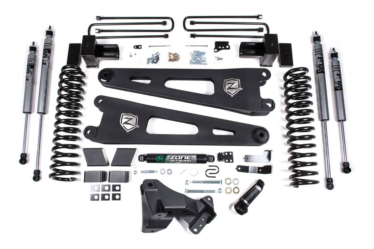 This 4-inch lift kit from Zone Offroad is designed for 2017–2019 Ford F250/F350 Super Duty 4WD diesel trucks. The kit provides 4 inches of front lift via coil springs and radius arm correction, plus 2 inches of rear lift via block kit to level the stance. Kits include radius arm drop brackets as standard, with the option to upgrade to Zone HD Radius Arms for added strength and durability. Shock upgrades are available in Nitro Series or FOX 2.0 Adventure Series. All Zone lift kits are backed by Factory Protection Plus, which includes a 5-year/60,000-mile drivetrain warranty and Zone Offroad's limited lifetime warranty.