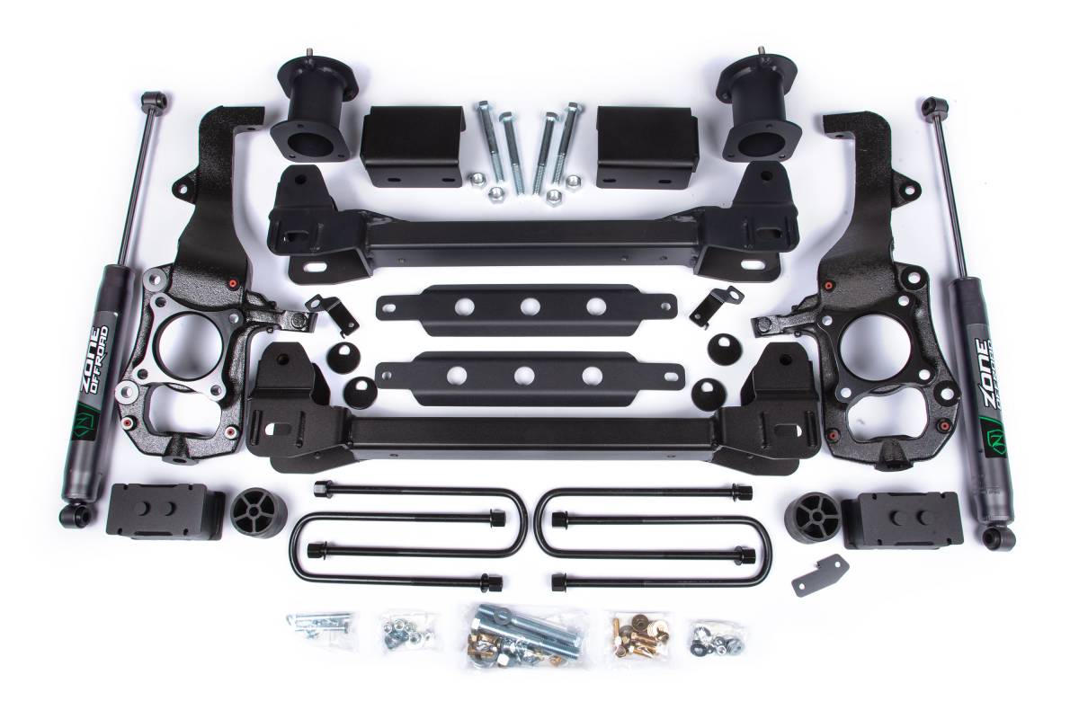 This 6-inch lift kit from Zone Offroad is engineered for 2021–2026 Ford F150 2WD trucks. The kit includes high-strength crossmembers, redesigned steering knuckles, strut spacers, and a rear block kit to raise the vehicle and level its stance. The suspension geometry corrections are designed to maintain ride quality, handling performance, and drivetrain alignment. The kit provides clearance for 35–37-inch tires and is compatible with Ford's Blue Cruise system through Factory Protection Plus.