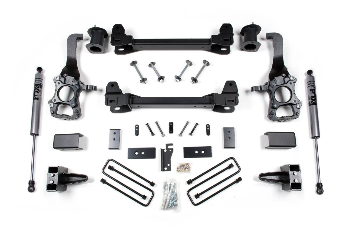 This 6-inch lift kit from Zone Offroad is designed to raise your 2014 Ford F150 2WD and provide clearance for up to 37-inch tires. The kit includes high-strength crossmembers, ductile iron steering knuckles, top-mounted strut spacers, and a rear block kit to lift and level the stance. All components needed for the installation are included.