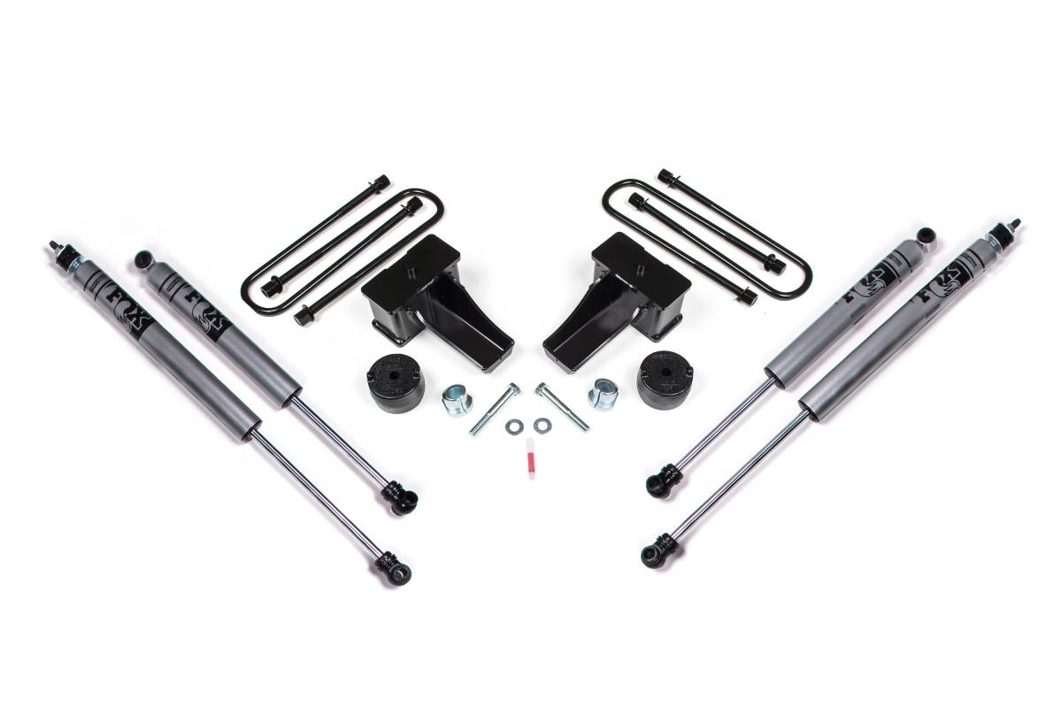 The Ford F250/F350 Super Duty leaves the factory with the front end raked down 1–2" lower than the rear. Zone Offroad's 2" Lift Kit addresses this by combining 2" front leveling coil spacers with replacement 2" rear lift blocks, producing a level to slightly tail-high stance. This configuration allows clearance for tires up to 35" and is well-suited for trucks equipped with camper shells or those that tow regularly, eliminating the tail-low stance common under load.
