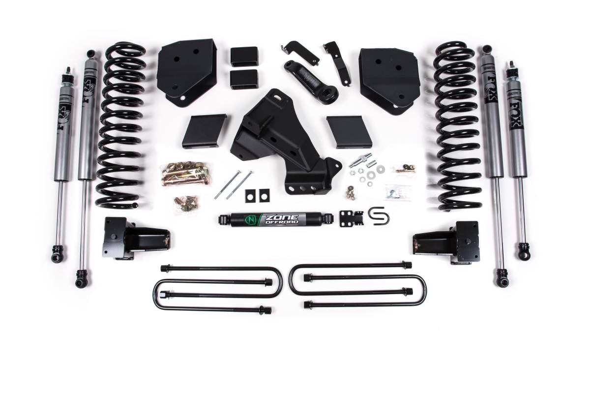 These 7-inch standard lift kits from Zone Offroad are engineered for the 2020–2022 Ford F250/F350 Super Duty 4WD Diesel. The kits utilize full-length coil springs, high-strength radius arm relocation brackets, steering and sway bar correction, and rear lift to level the stance. Shocks are included, and all kits are backed by a 5-year/60,000-mile drivetrain warranty.