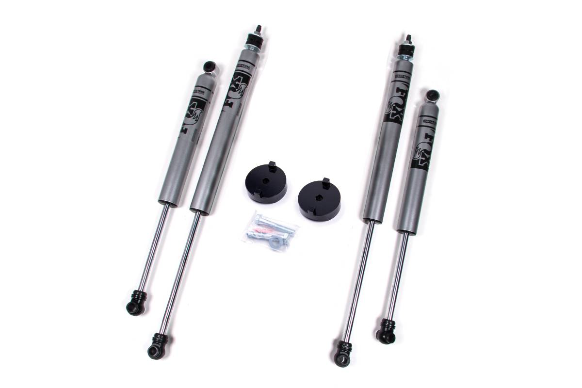 This configuration includes the coil spacer leveling kit paired with FOX 2.0 Adventure Series shocks. The FOX 2.0 Adventure Series features a nitrogen-charged twin-tube design, 10-stage velocity-sensitive valving, dual-welded ends for increased strength, self-lubricating seals, a black powder coat finish, and a 2-inch diameter steel body. Front lift height: 1 inch via coil spacer. Rear lift height: stock (0 inches).
