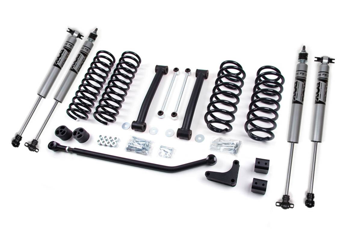 - Transfer case drop kit included to correct rear driveline angle and allow use of the factory rear driveshaft
