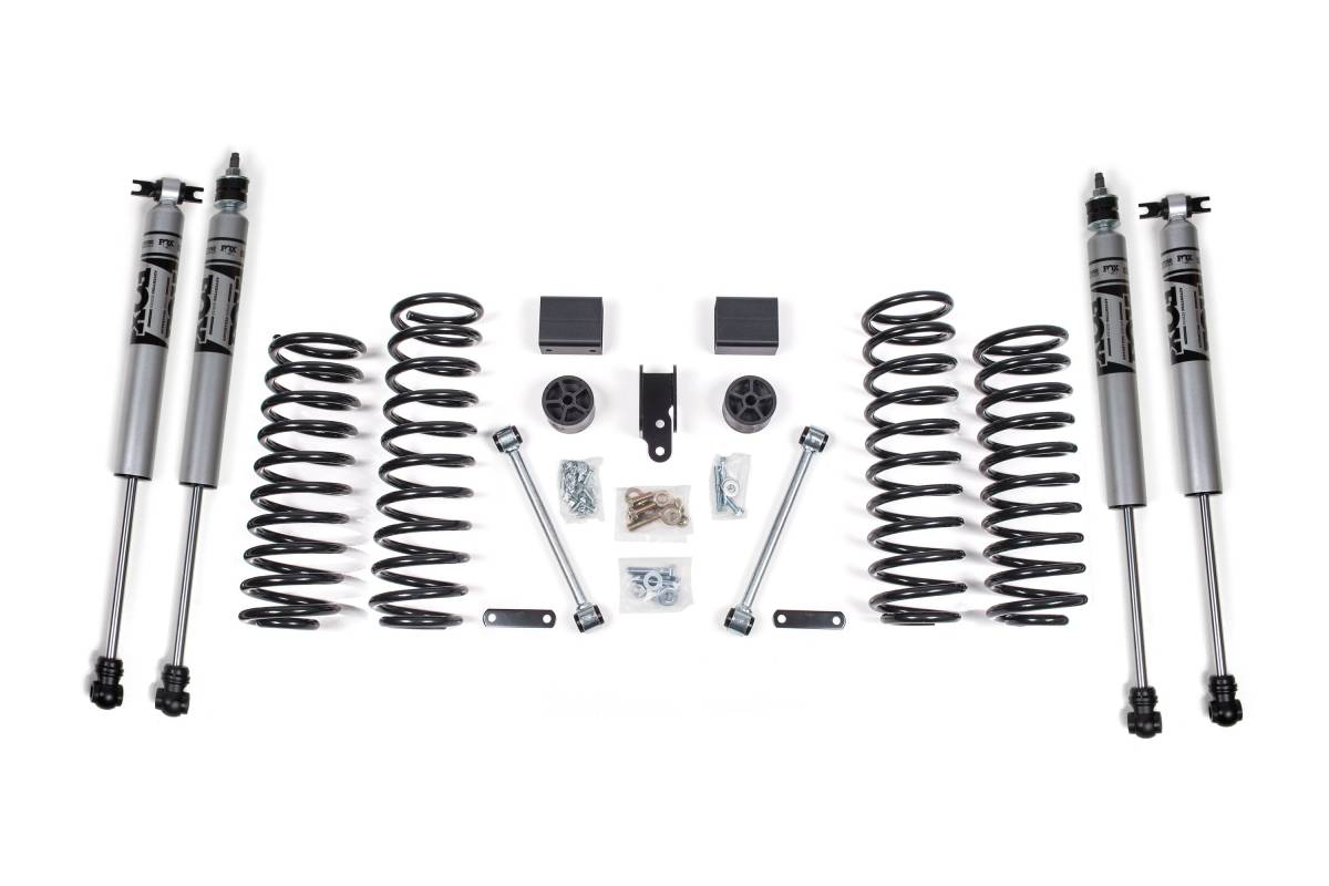 This 3-inch lift kit is designed for 2012–2018 4WD 4-door Jeep Wrangler JKs. It increases droop and wheel travel while providing sufficient lift to fit 35-inch tires. Heavy-duty coil springs are included to handle demanding off-road use while maintaining ride quality.