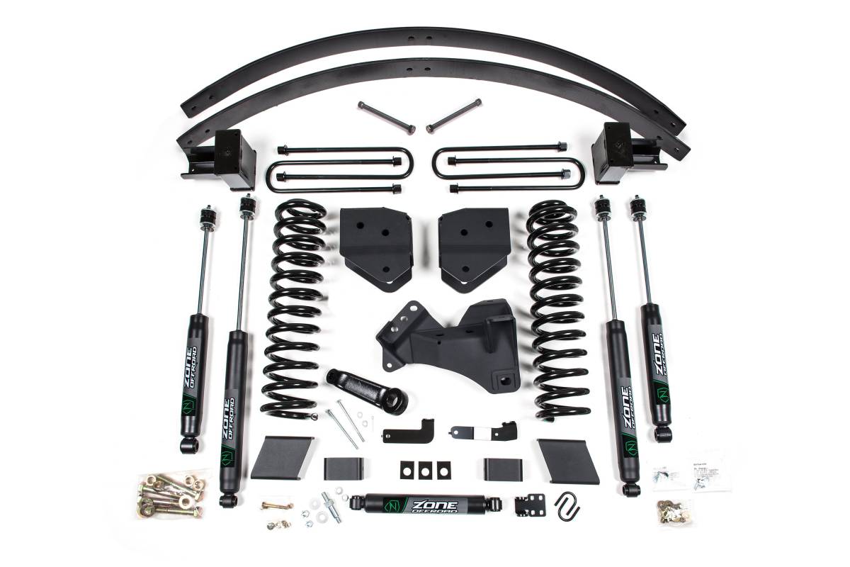 This 6" lift kit from Zone Offroad is designed for 2017–2019 Ford F250/F350 Super Duty 4WD gas trucks. The kit includes all components needed to reliably lift your truck and supports fitment of up to 37" tires. It features front coil springs, radius arm drop brackets, steering correction hardware, and rear lift blocks or optional add-a-leaf packs to achieve the desired stance and performance. Shock options include Nitro Series Gas Shocks or FOX 2.0 Adventure Series for greater performance and control. All Zone lift kits are backed by Factory Protection Plus, which includes a 5-year/60,000-mile drivetrain warranty and Zone Offroad's limited lifetime warranty.
