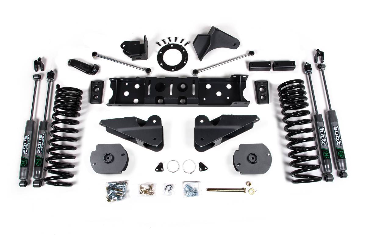 The Zone Offroad 4 Inch Lift Kit is engineered exclusively for 2025 RAM 2500 trucks with diesel engines. This kit lifts the front 4 inches and the rear 2.5 inches, providing a leveled, aggressive stance with enhanced off-road capability and on-road comfort. It features heavy-duty Zone Offroad Radius Arm Drop brackets, a forged pitman arm, and a choice of high-performance shocks. Designed for standard travel, this system does not require a transfer case indexing ring or crossmember, simplifying the installation process.