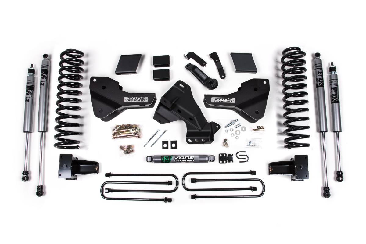 Zone Offroad's Reinforced Radius Arm Bracket Kits are designed to restore proper suspension geometry and improve ride quality on 2023–2026 Ford F-250 and F-350 Super Duty trucks (single rear wheel models only). Engineered for strength and precision, these heavy-duty drop brackets correct axle rotation to return caster to factory specs, improving steering stability, handling, and tracking on lifted vehicles. By lowering the radius arm mounting points, the system helps eliminate coil bowing and ensures the coil springs are seated correctly. These kits are available with a choice of Zone Nitro twin-tube shocks or FOX 2.0 Adventure Series shocks.