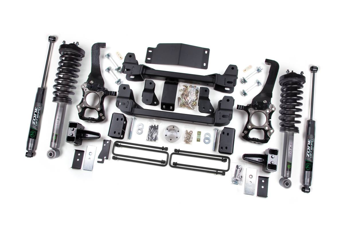 The Zone Offroad 4-inch Lift Kit for the 2009–2013 Ford F-150 4WD delivers added ground clearance and the ability to run up to 35-inch tires while maintaining solid on-road handling. The lift is built around precision-engineered, USA-made steering knuckles that properly correct suspension geometry at the taller ride height. The kit includes heavy-duty crossmembers, a differential drop, sway bar drop brackets, a skid plate, rear lift blocks, and new U-bolts for a complete, properly engineered suspension upgrade. In the rear, 4-inch lift blocks provide a clean, aggressive stance while retaining some of the factory rake.