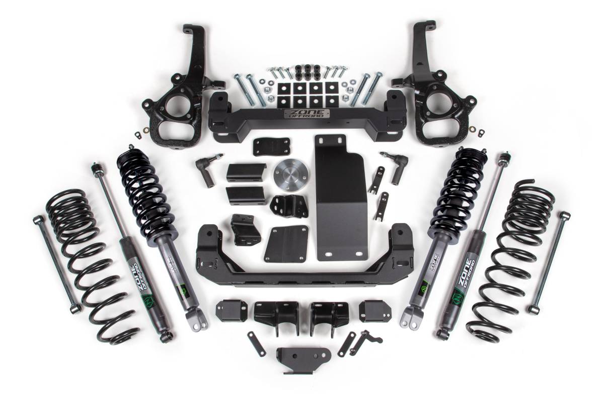 Front Configuration: Loaded Strut Replacement (6" front lift). Rear Configuration: Coil Spring (5" rear lift) with Nitro Series rear shocks. Lift height range: 6–7.5".
