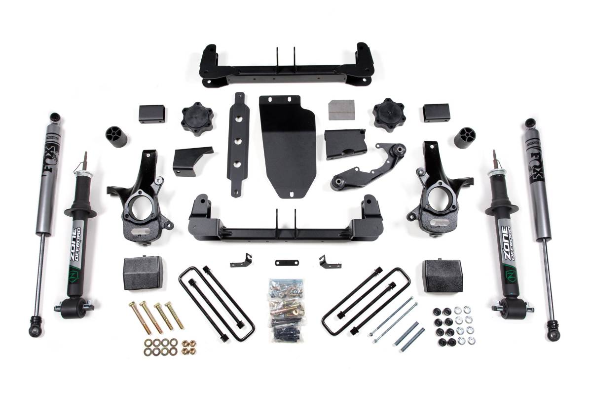 Configured for trucks with Aluminum or Stamped Steel factory control arms. Front lift is achieved via Cross Member & Strut Spacer (6.5" front lift) with a Zone Nitro Strut, paired with FOX 2.0 Adventure Series rear shocks and a 5" rear lift block.