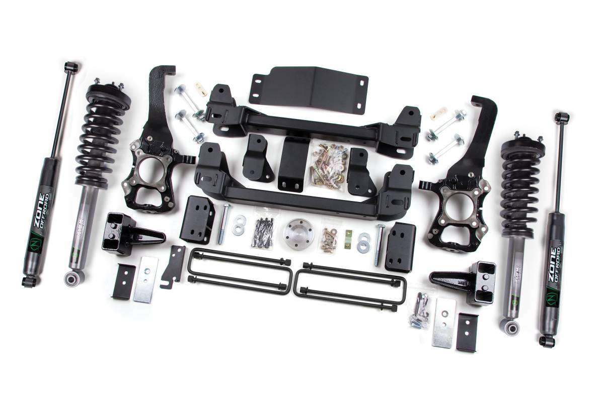 The Zone Offroad 6-inch Lift Kit for the 2009–2013 Ford F-150 4WD is engineered to deliver increased height, ground clearance, and an aggressive stance. The system provides clearance for up to 37-inch tires while maintaining solid on-road handling. Built around precision-engineered steering knuckles that properly correct suspension geometry at the taller ride height, the kit also includes heavy-duty crossmembers, a differential drop, sway bar drop brackets, a skid plate, rear lift blocks, and new U-bolts. Zone Nitro loaded struts arrive fully assembled and ready to install, paired with matching Zone Nitro rear shocks for balanced performance. Rear lift block options allow the owner to fine-tune the stance of the truck. Made in the USA.