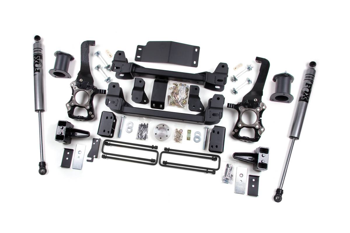 The Zone Offroad 6-inch Lift Kit for the 2014 Ford F-150 4WD provides the clearance needed to run up to 37-inch tires while maintaining solid on-road handling. The lift is built around precision-engineered steering knuckles that properly correct suspension geometry at the taller ride height. The system also includes heavy-duty crossmembers, a differential drop, sway bar drop brackets, a skid plate, rear lift blocks, and new U-bolts for a complete suspension upgrade. This kit is proudly Made in the USA.