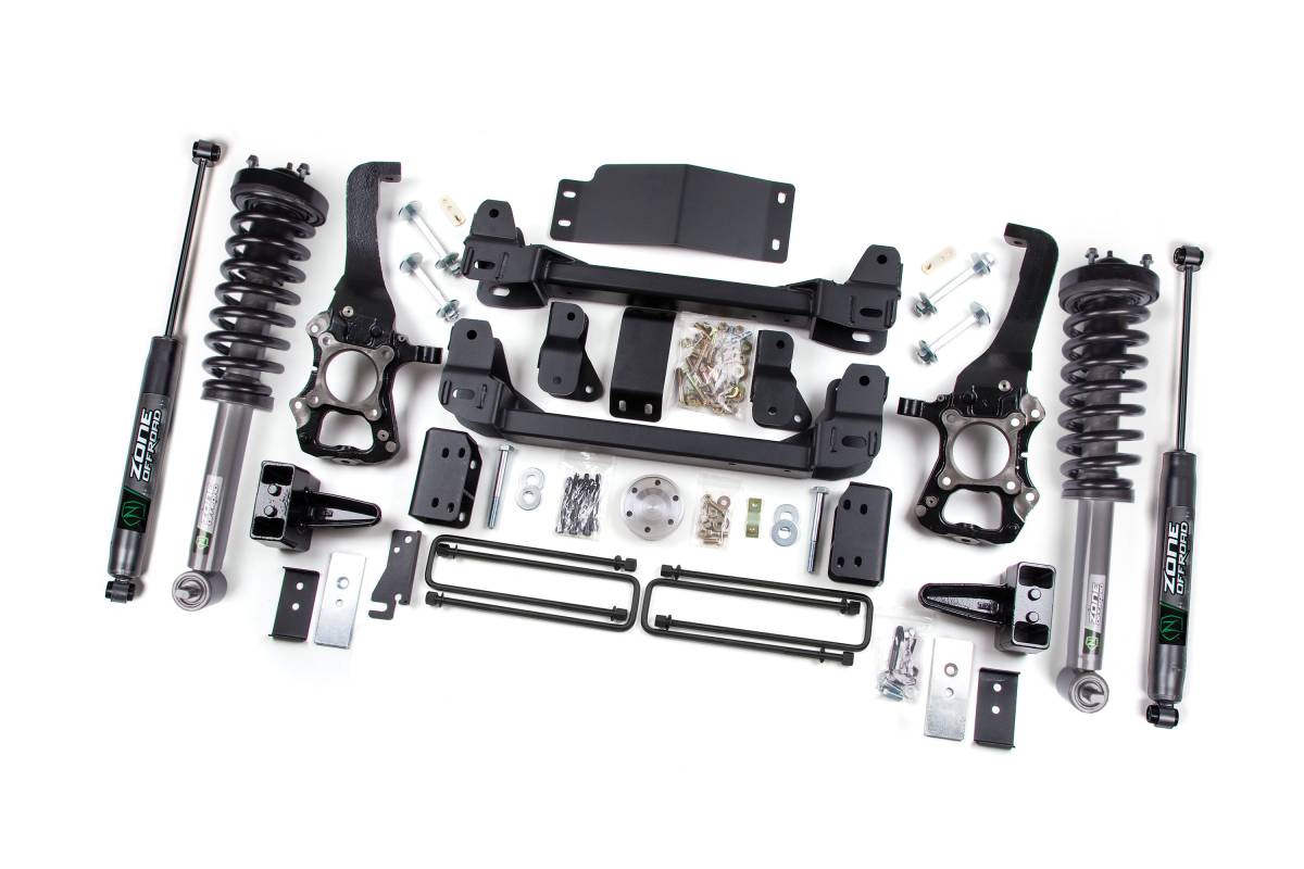 The Zone Offroad 4-inch Lift Kit for the 2014 Ford F-150 4WD delivers added clearance and the ability to run up to 35-inch tires while maintaining solid on-road handling. The kit is built around precision-engineered, USA-made ductile iron steering knuckles that properly correct suspension geometry at the taller ride height. Heavy-duty crossmembers, a differential drop, sway bar drop brackets, a skid plate, rear lift blocks, and new U-bolts round out the system for a complete, properly engineered suspension upgrade.