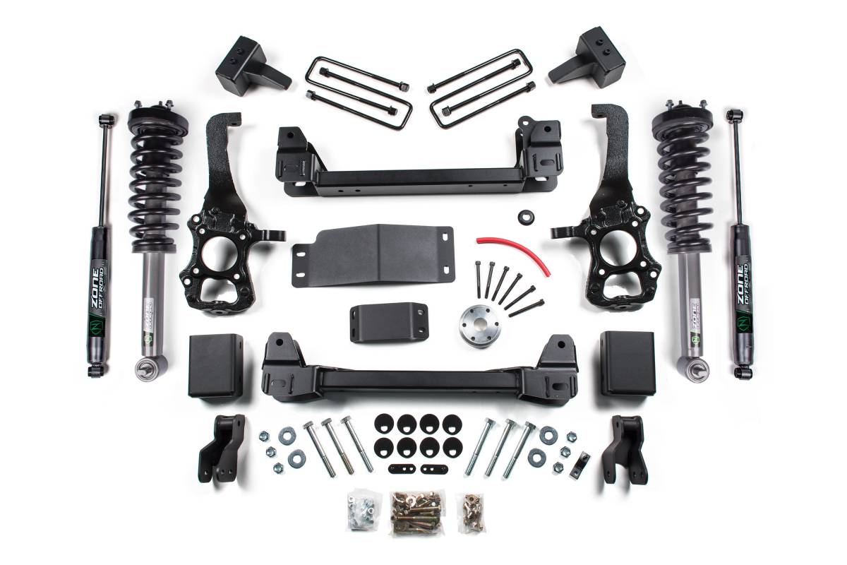 The Zone Offroad 4-inch Lift Kit for the 2015–2020 Ford F-150 4WD delivers added clearance and everyday practicality, supporting up to 35-inch tires while maintaining solid on-road handling. The lift is built around precision-engineered ductile iron steering knuckles made in the USA, which properly correct suspension geometry at the raised ride height. The kit also includes heavy-duty crossmembers, a differential drop, sway bar drop brackets, a skid plate, rear lift blocks, and new U-bolts for a complete, properly engineered suspension upgrade. Front configuration options allow you to retain factory struts via strut spacers or replace the front struts entirely with Zone Nitro loaded struts. Rear shock options include Zone Nitro or FOX 2.0 Adventure Series shocks. The 4-inch rear blocks retain some factory rake for those who prefer a slightly higher rear stance for hauling or towing.